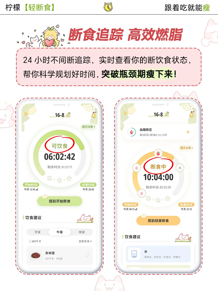 一键开启断食、饮食提醒⏰,24小时实时追踪,饮食时间内想吃就吃🍙,轻松吃瘦没负担~🙆