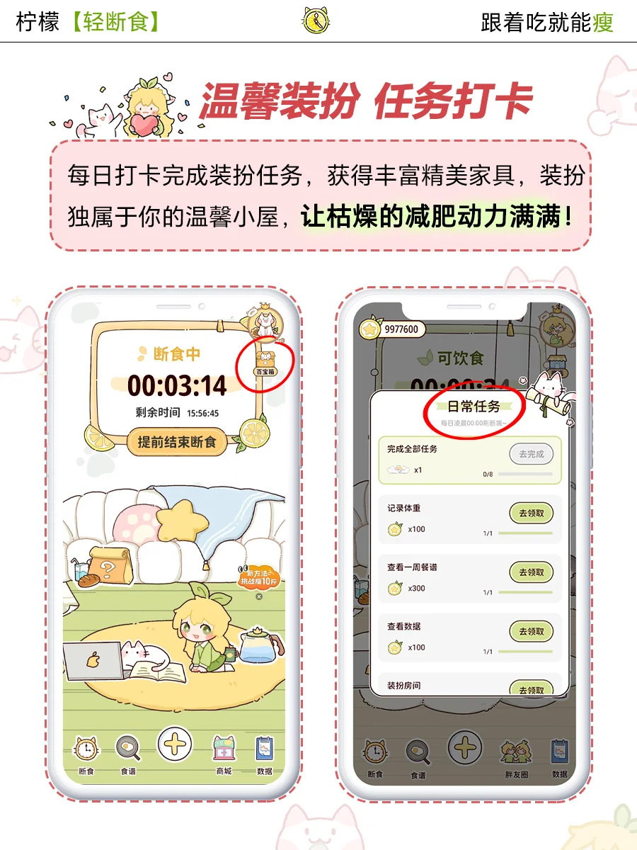 每日打卡完成装扮任务,获得丰富精美家具,装扮独属于你的温馨小屋,让枯燥的减肥动力满满!