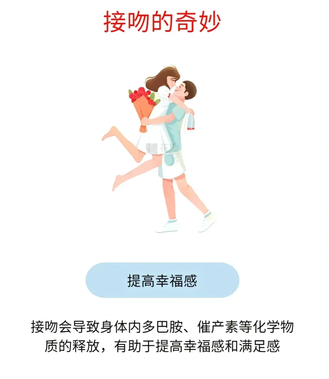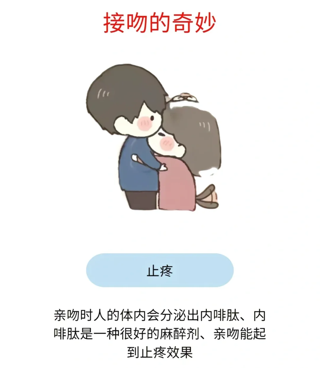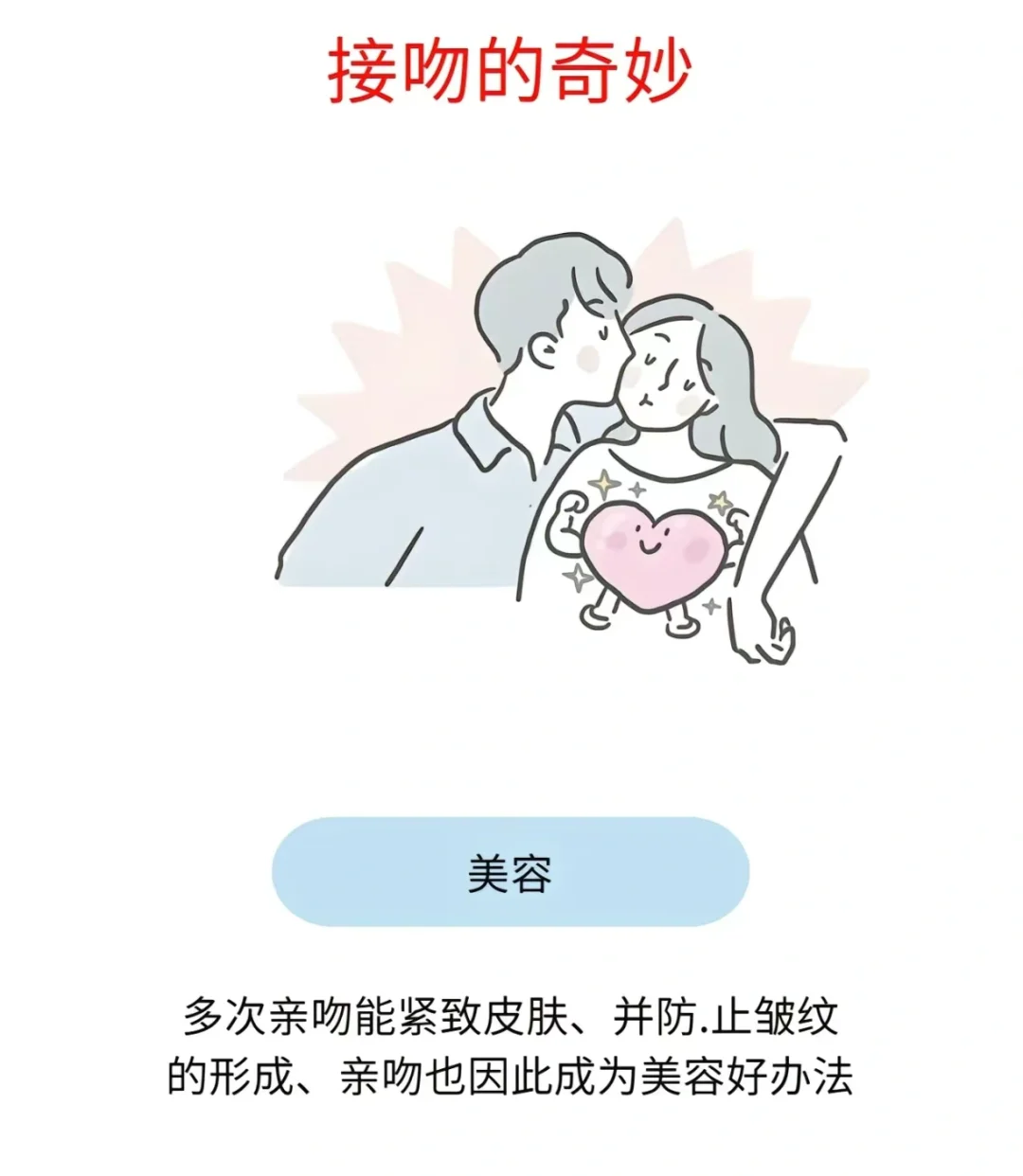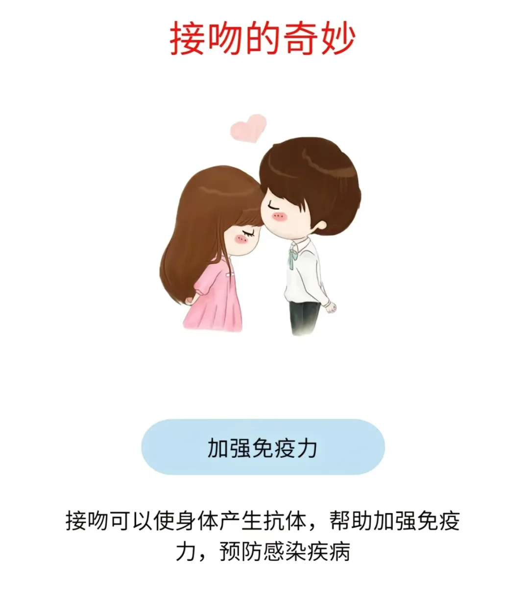 人们都说经常接吻能够减肥,事实上这是真的,如果每天接吻超过三次,对减肥是十分有帮助的,而且接吻的次数多一点,在这里的时候也能够给人带来快感,同时也可以减轻饥饿感,因为在接吻的时候,人们的心跳就会加速,心跳加速,就会促进身体的血液循环,进而就会加速体内脂肪的燃烧。虽然感觉次数不是特别多,但是能够让夫妻和情侣之间的感情更加稳固。