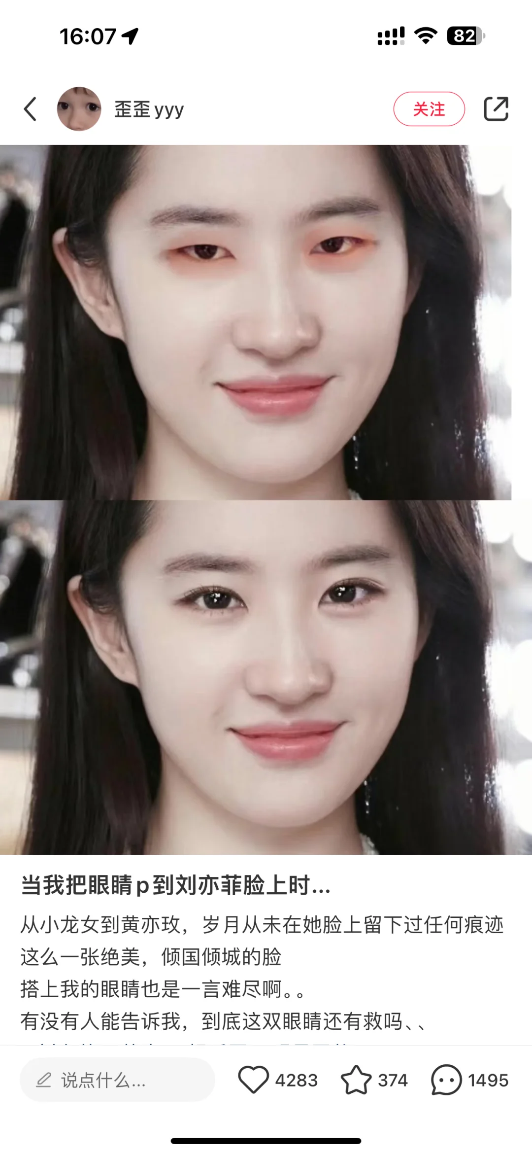 哈哈哈哈哈哈哈看到这个姐妹的帖子,好有趣,就p了两张自己,一张是没笑的照片,一张是笑着的眼睛,不得不说,天仙为什么是天仙呢?因为她的五官缺一个都够不成“天仙”,放别人脸上都平平无奇,啧啧啧,真·女娲伟大之作!!