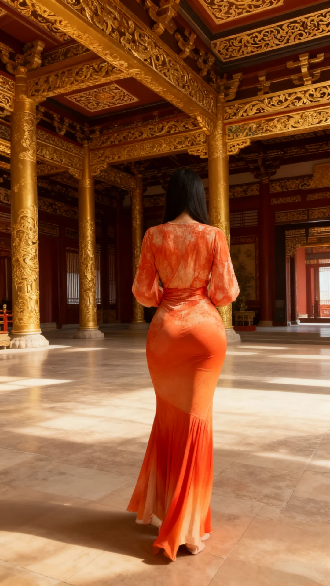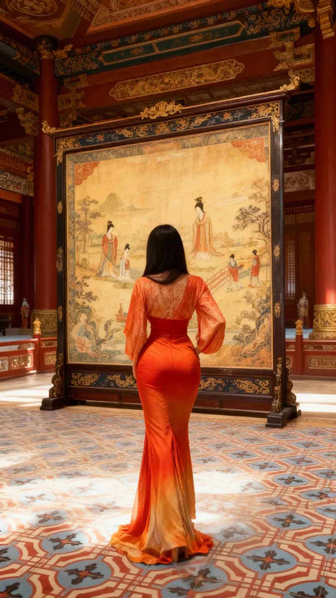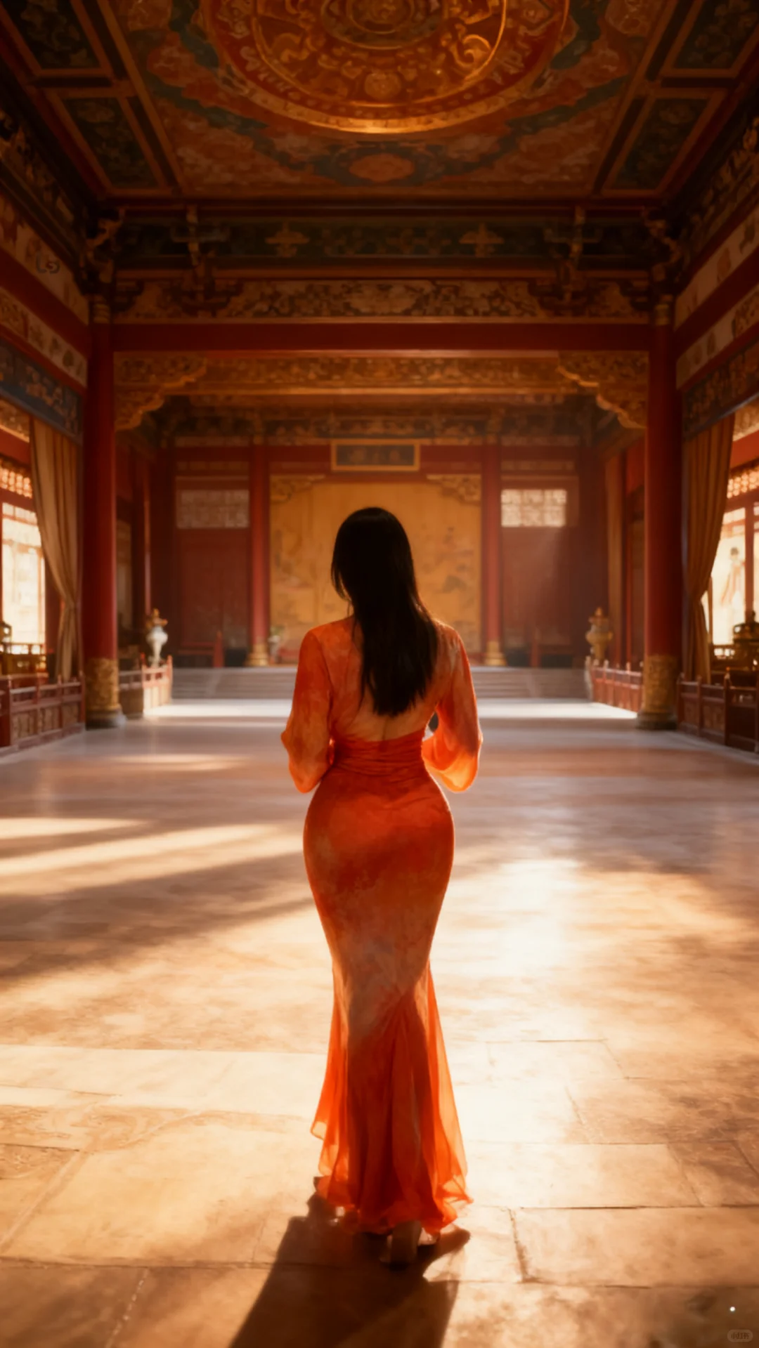 梦回唐朝,一抹艳丽的橙色在宫殿大厅中悄然绽放。她身穿一袭长裙,鲜亮的橙色由肩部渐变至裙摆,宛如夕阳余晖,温暖而迷人。乌黑的长发如瀑布般披散在背后,随着微风轻拂,散发出淡淡的芳香。露背的设计恰到好处地展现出她优雅的颈线与柔美的背影,既性感又不失高贵。华丽的宫殿装饰映衬出她的身影,金碧辉煌的琉璃瓦、雕刻精美的柱子,仿佛带人穿越时空,回到那个繁华盛世的唐朝。她静静伫立,似在思索古老的诗篇,又似在感受宫廷的繁华与宁静。那一抹橙色在金光中熠熠生辉,仿佛是唐朝盛世的象征,既热烈又典雅。她的背影,定格在那一瞬间的永恒,诉说着古韵今承的美丽传说。穿越千年,她的身影依旧迷人,宛如一幅流动的画卷,让人心生向往,梦回那个繁华而神秘的唐朝盛世。#我的休闲时光十月激励计划 #我的休闲时光蜗居物语 #盛世需要美人点缀 #一袭优雅醉了千年 #唯美古风带你一起穿越 #穿越时空的浪漫 #倾国倾城的女孩 #古典 #妩媚勾魂风情万种 #生活美学