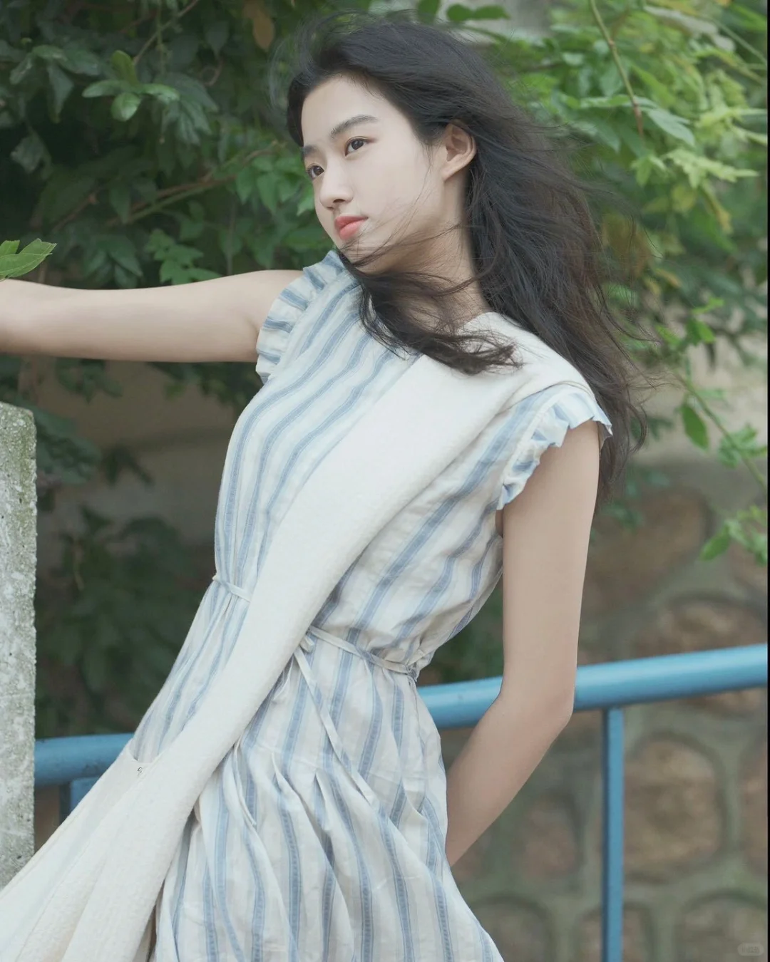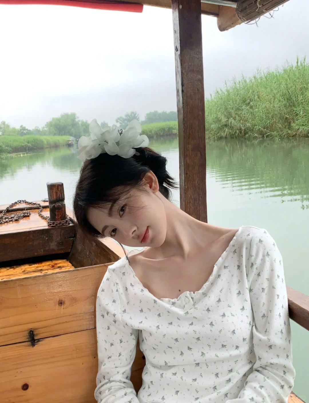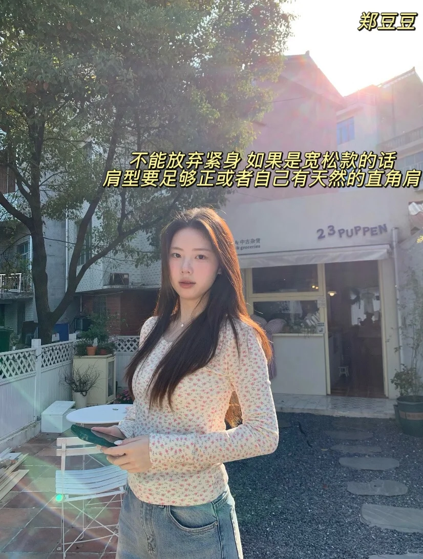 气质来源于肩颈的舒展,淡颜没有浓颜五官的天然焦点,肩颈线条就成了隐性气场来源:宽松款如果肩型塌陷,体态不好的话,会显得拖沓没精气神,淡颜的清透感会被掩盖。但肩型正的时候,哪怕是碎花这种衣服,也会因为线条的利落,多一份干练的气质。再说脖颈漏肤度,这不是刻意露肤,而是留白。淡颜的美需要呼吸感,领口的空白能拉开面部与衣服的距离,避免被布料包裹得压抑,让视线自然聚焦到面部的柔和轮廓上。还有紧身这一点,不是要显身材,而是要定轮廓感,遵循上紧下松原则。宽松衣服容易让身体线条模糊,女性的柔美感和淡颜的轻盈感会跟着散,而适度的紧身能勾勒出身体的柔和曲线