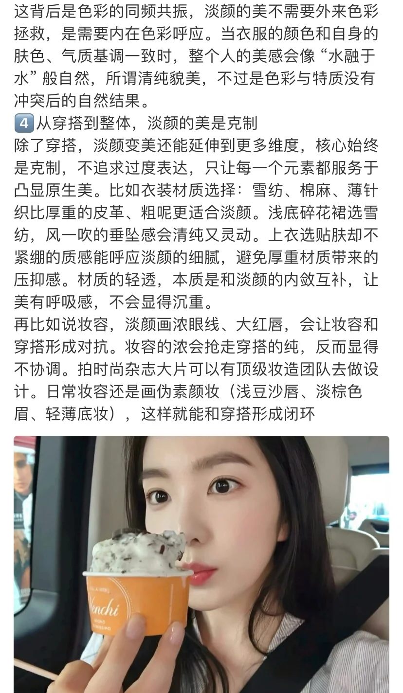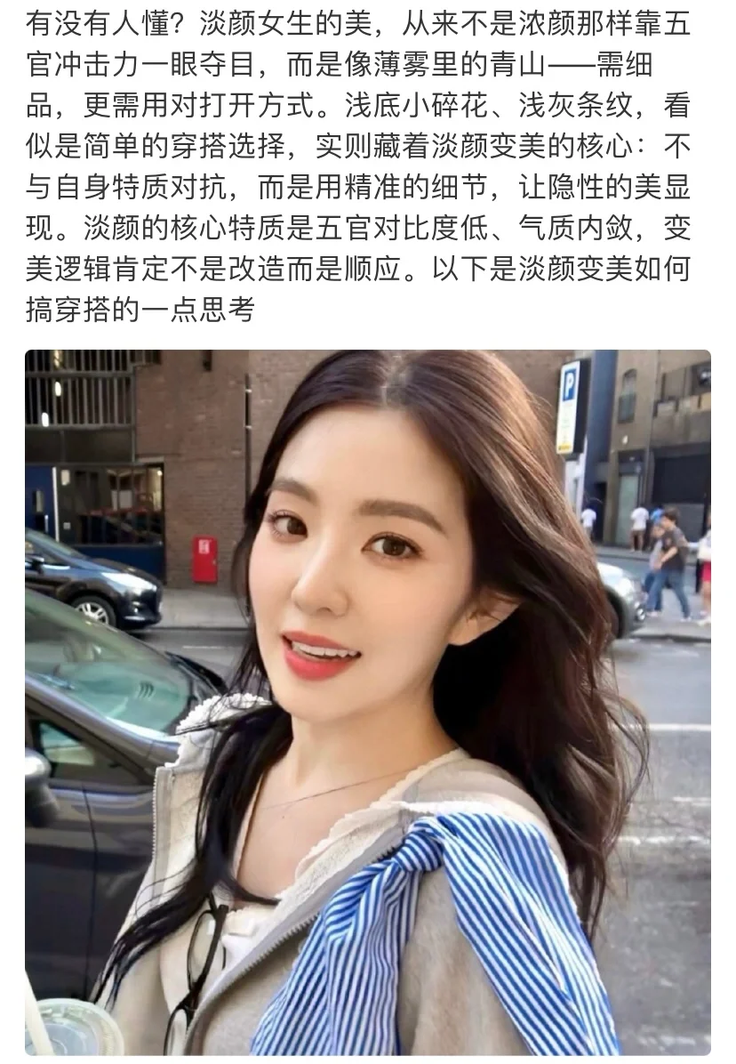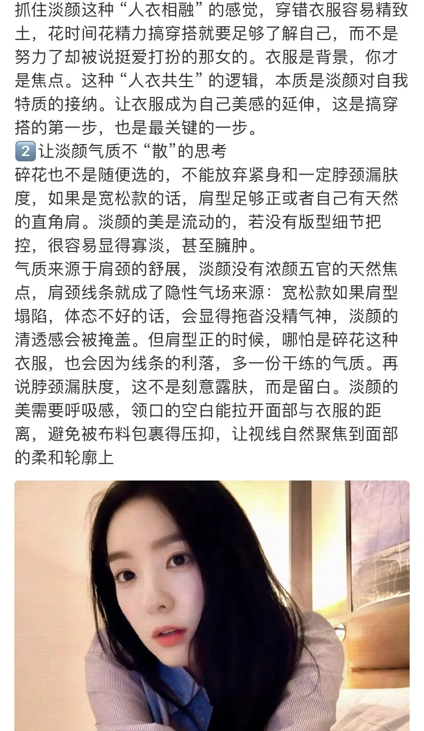 抓住淡颜这种 “人衣相融” 的感觉,穿错衣服容易精致土,花时间花精力搞穿搭就要足够了解自己,而不是努力了却被说挺爱打扮的那女的。衣服是背景,你才是焦点。这种 “人衣共生” 的逻辑,本质是淡颜对自我特质的接纳。让衣服成为自己美感的延伸,这是搞穿搭的第一步,也是最关键的一步