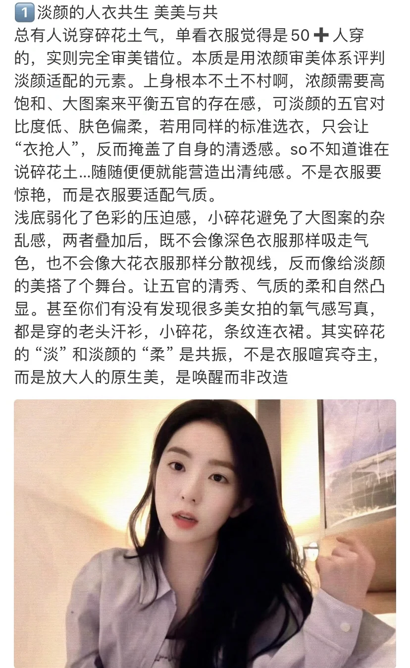 总有人说穿碎花土气,单看衣服觉得是50➕人穿的,实则完全审美错位。本质是用浓颜审美体系评判淡颜适配的元素。上身根本不土不村啊,浓颜需要高饱和、大图案来平衡五官的存在感,可淡颜的五官对比度低、肤色偏柔,若用同样的标准选衣,只会让 “衣抢人”,反而掩盖了自身的清透感。so不知道谁在说碎花土…随随便便就能营造出清纯感。不是衣服要惊艳,而是衣服要适配气质。