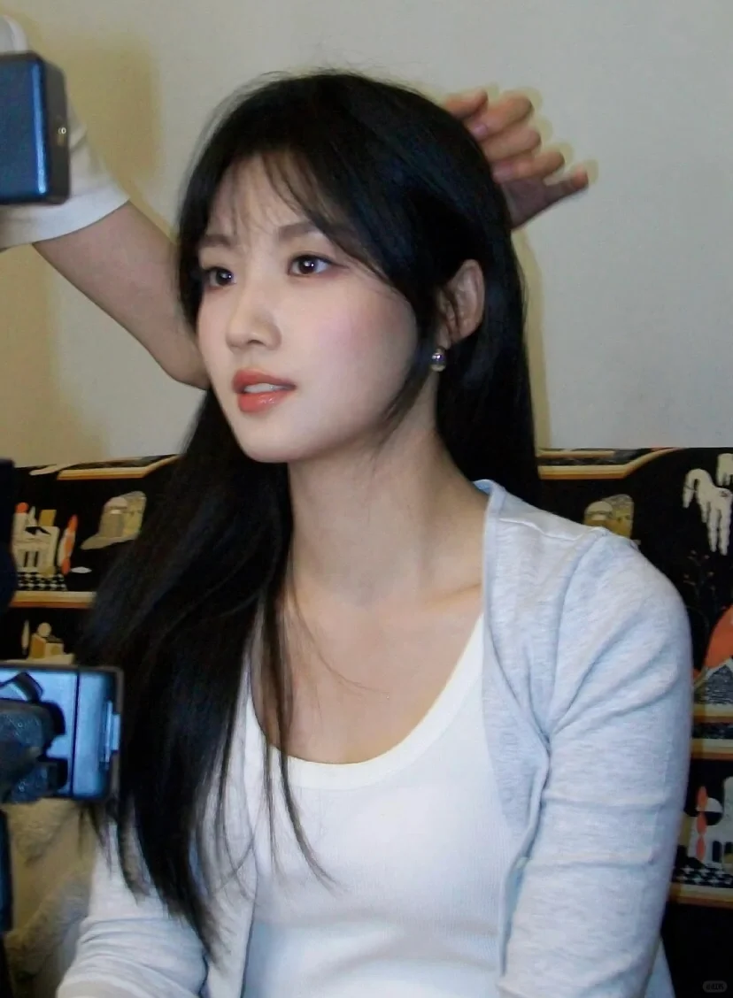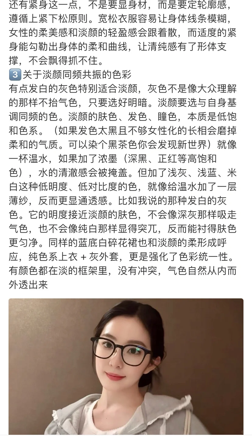 有点发白的灰色特别适合淡颜,灰色不是像大众理解的那样不抬气色,只要选好明暗。淡颜要选与自身基调同频的色。淡颜的肤色、发色、瞳色,本质是低饱和色系。(如果发色太黑且不够女性化的长相会磨掉柔和的气质。可以染个黑茶色你会发现新世界