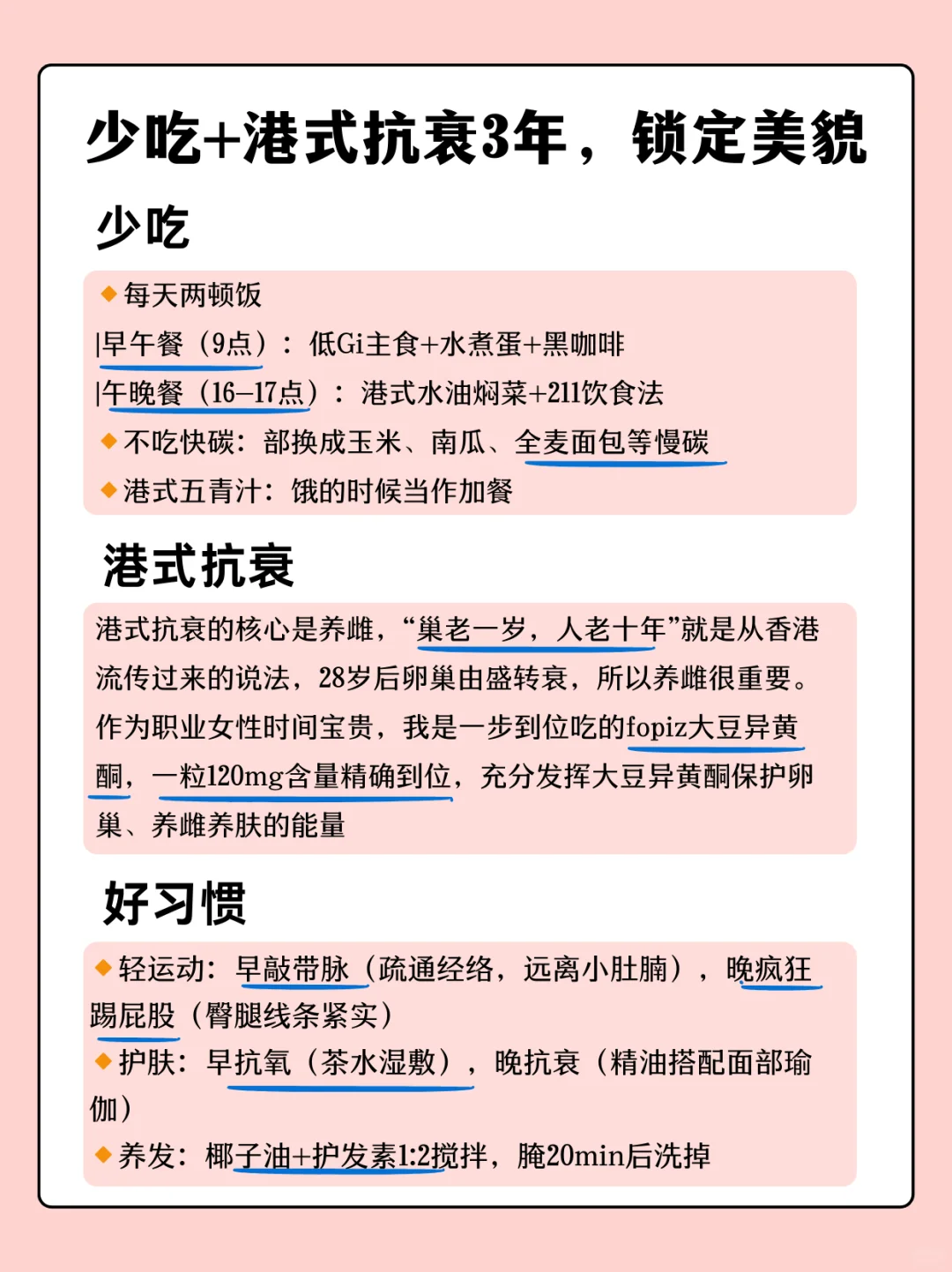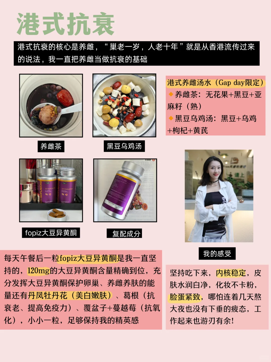 港式抗衰的核心是养雌,“巢老一岁,人老十年”就是从香港流传过来的说法,28岁后卵巢由盛转衰,雌素也随之下降,叠加熬夜、不规律饮食习惯、压力大都会加速雌素下滑的速度,没有雌素撑腰,皮肤就会斑点蜡黄,头发松动,失去腰身曲线,精力不济...