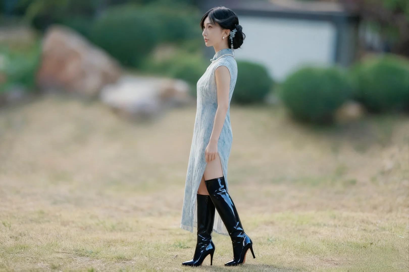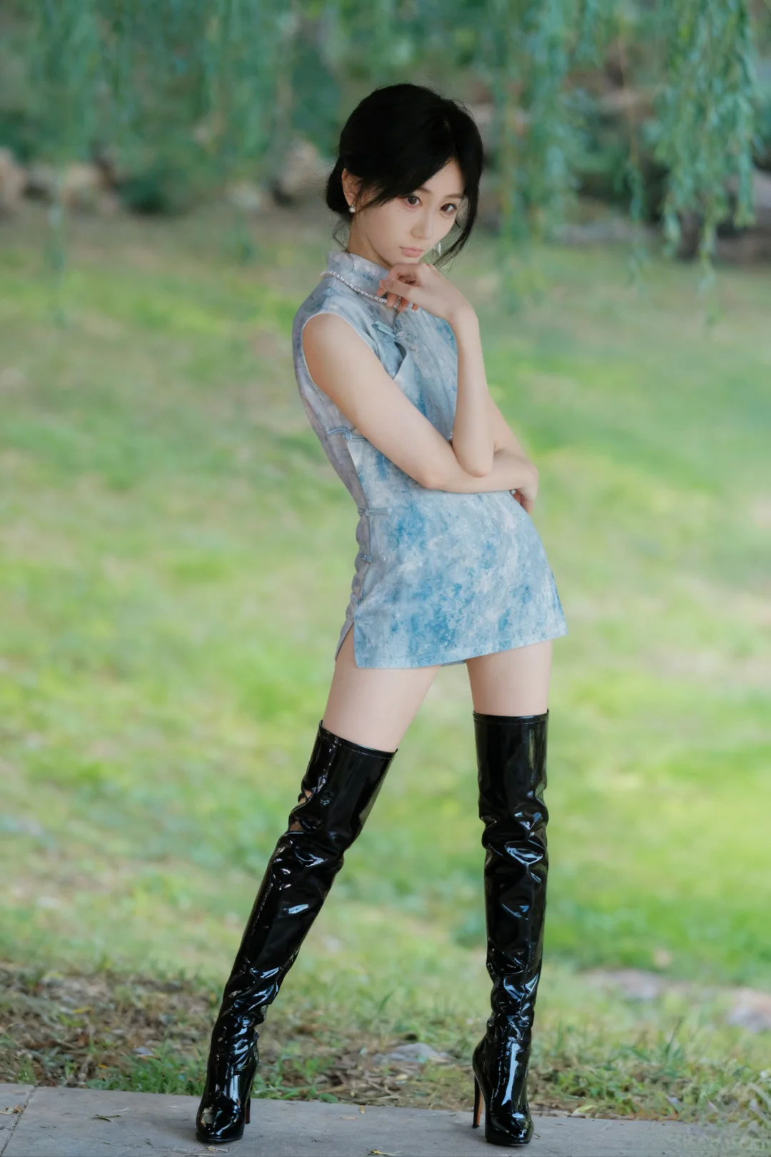 浅蓝色的水墨旗袍,把江南女子的温婉拿捏得死死的,结果一配上黑色亮面过膝长靴,瞬间变身国风辣妹,走在中式园林里,感觉自己就是时尚女主角!