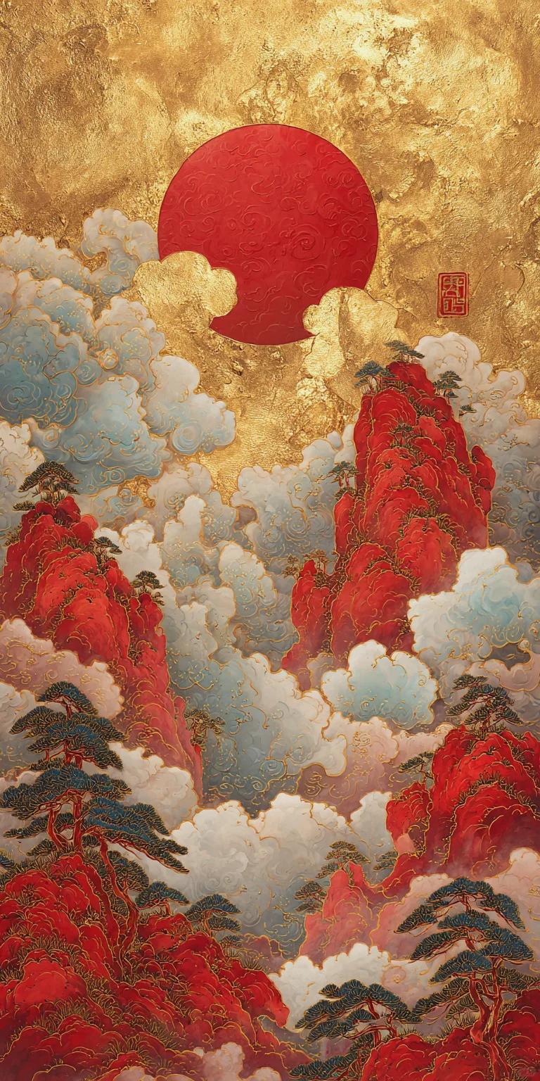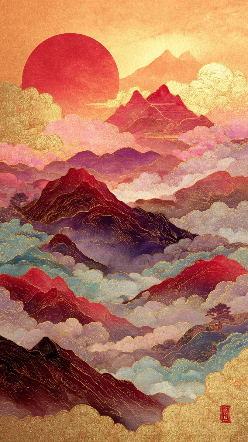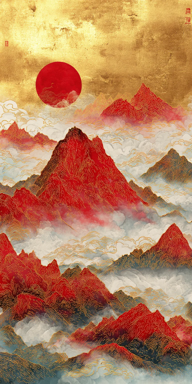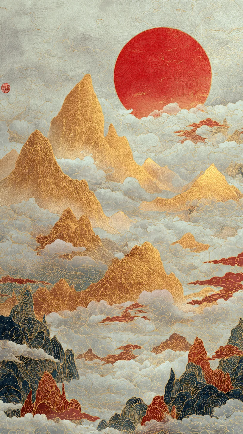 Chinese landscape painting, with golden mountains and a red sun in the background, in the traditional Chinese style. Colorful clouds, delicate brushstrokes, and soft colors create a delicate, embroidered-like effect. The artwork features gold foil embellishments and a magnificent, misty mountain peak.