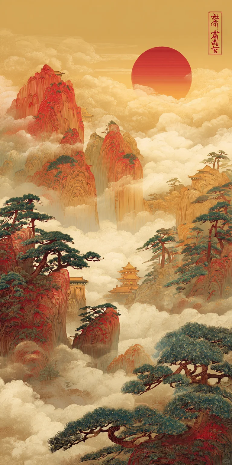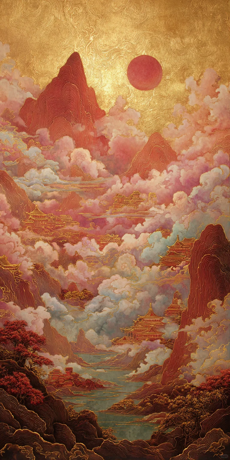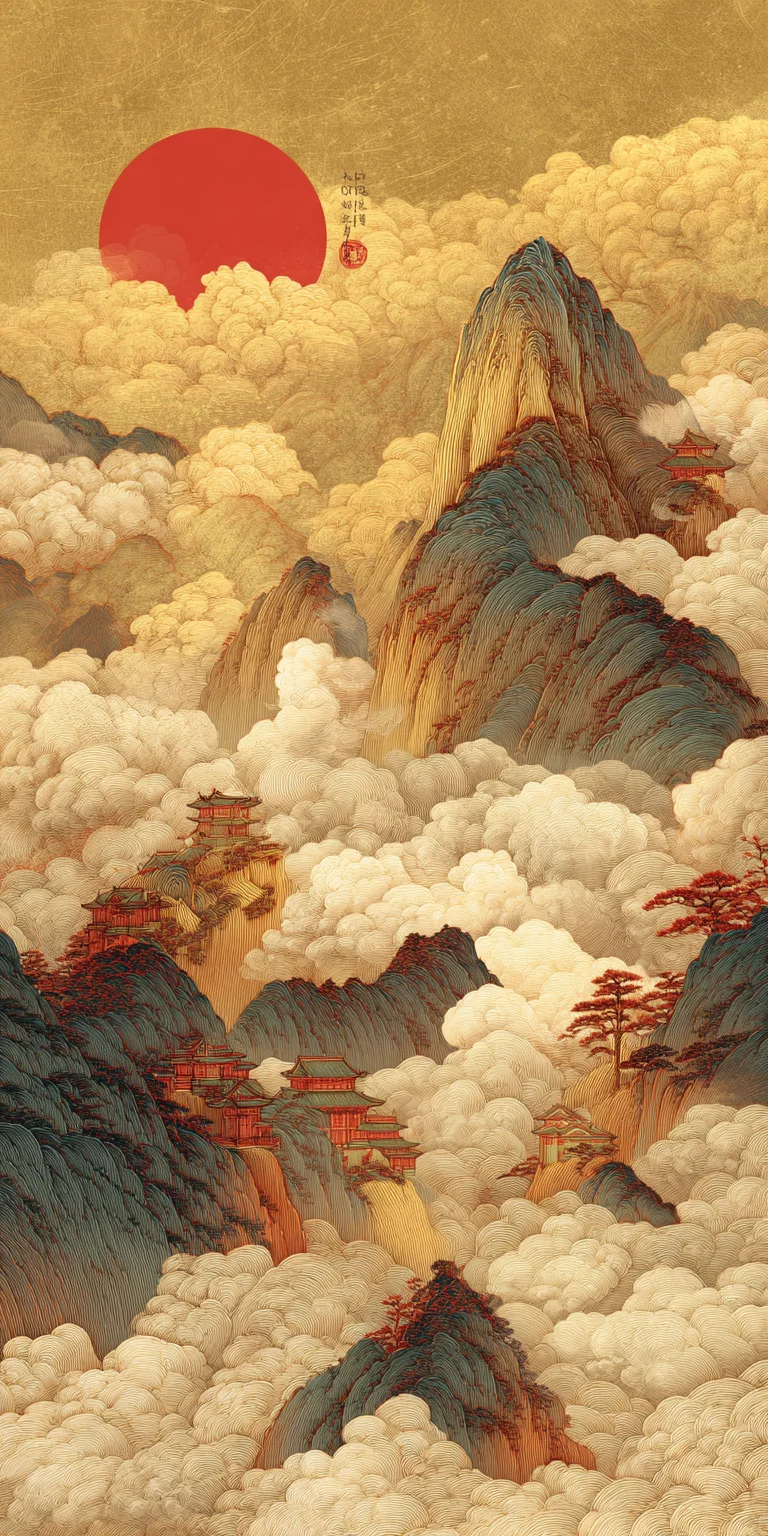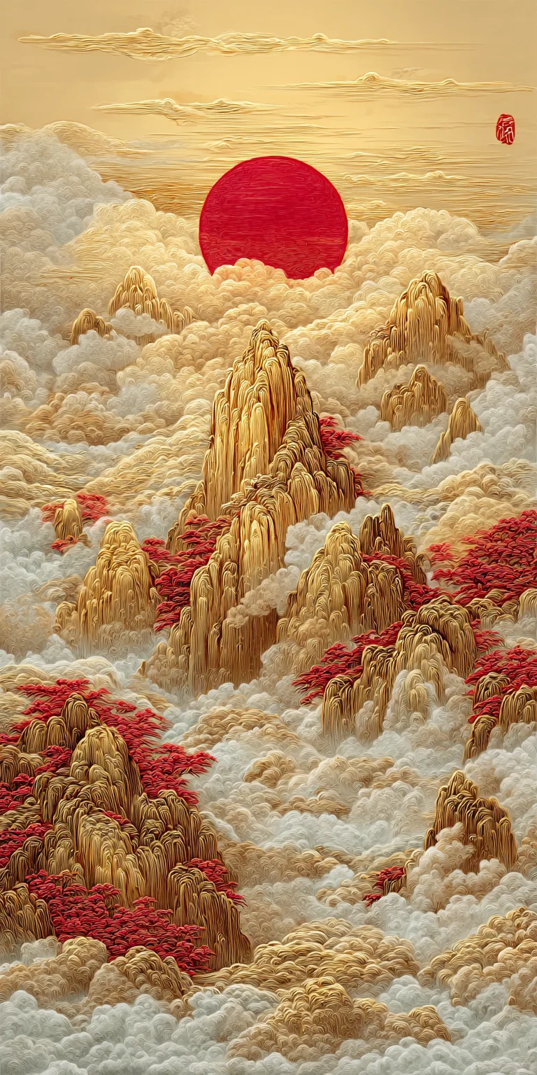 这幅中国山水画以金色山脉和红日为背景,展现了传统的中国风格。色彩斑斓的云彩、细腻的笔触和柔和的色彩营造出精致的刺绣效果。作品以金箔点缀,描绘出云雾缭绕、气势磅礴的山峰。