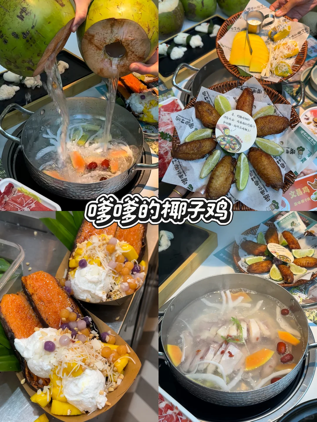 鲜摘的🥥椰子,三个椰子一锅汤!非常鲜甜,用来涮肉超嫩~先喝汤再吃肉,还有各种海鲜
