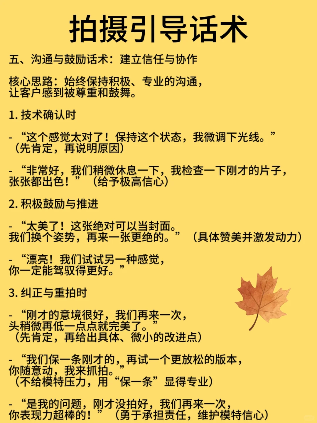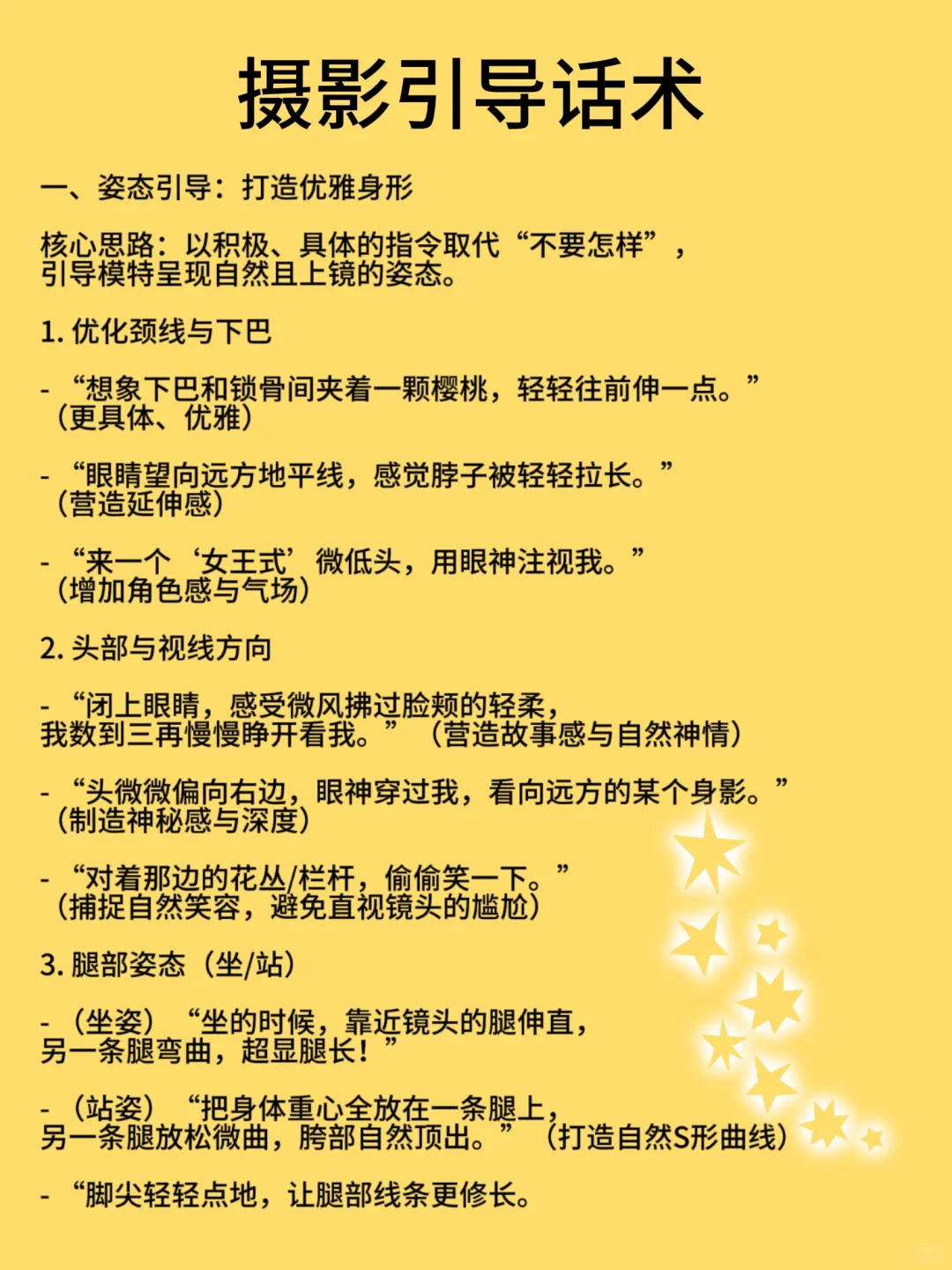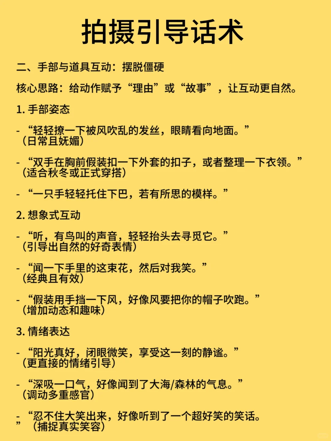 核心思路:以积极、具体的指令替代“不要怎样”,引导模特呈现自然又上镜的姿态。