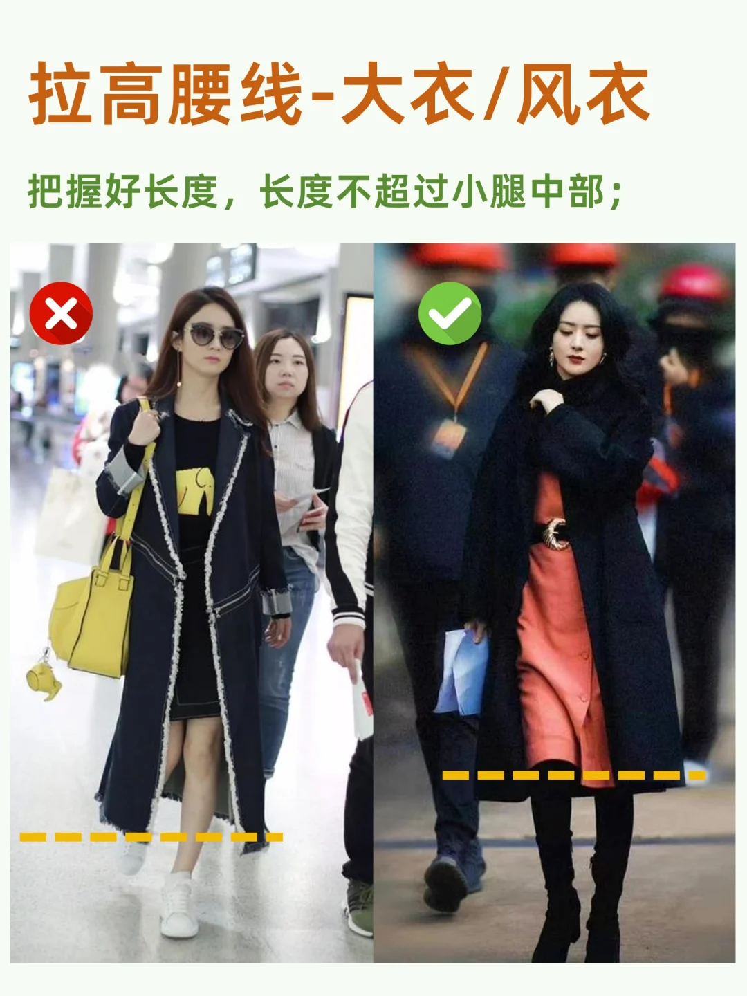 🧥大衣&风衣:不要超过小腿中部,太长会显得拖沓;不适合个子娇小的女生;
