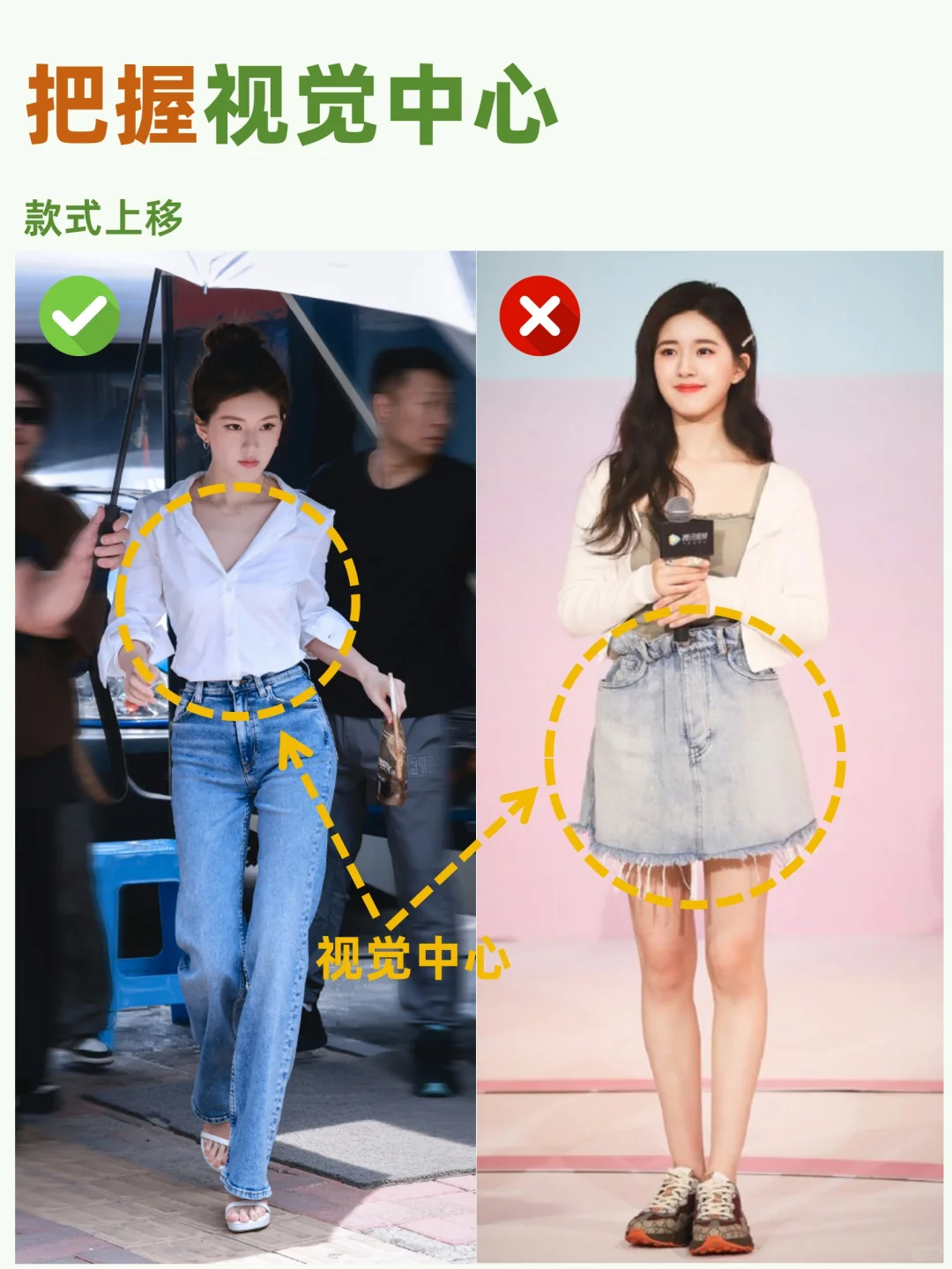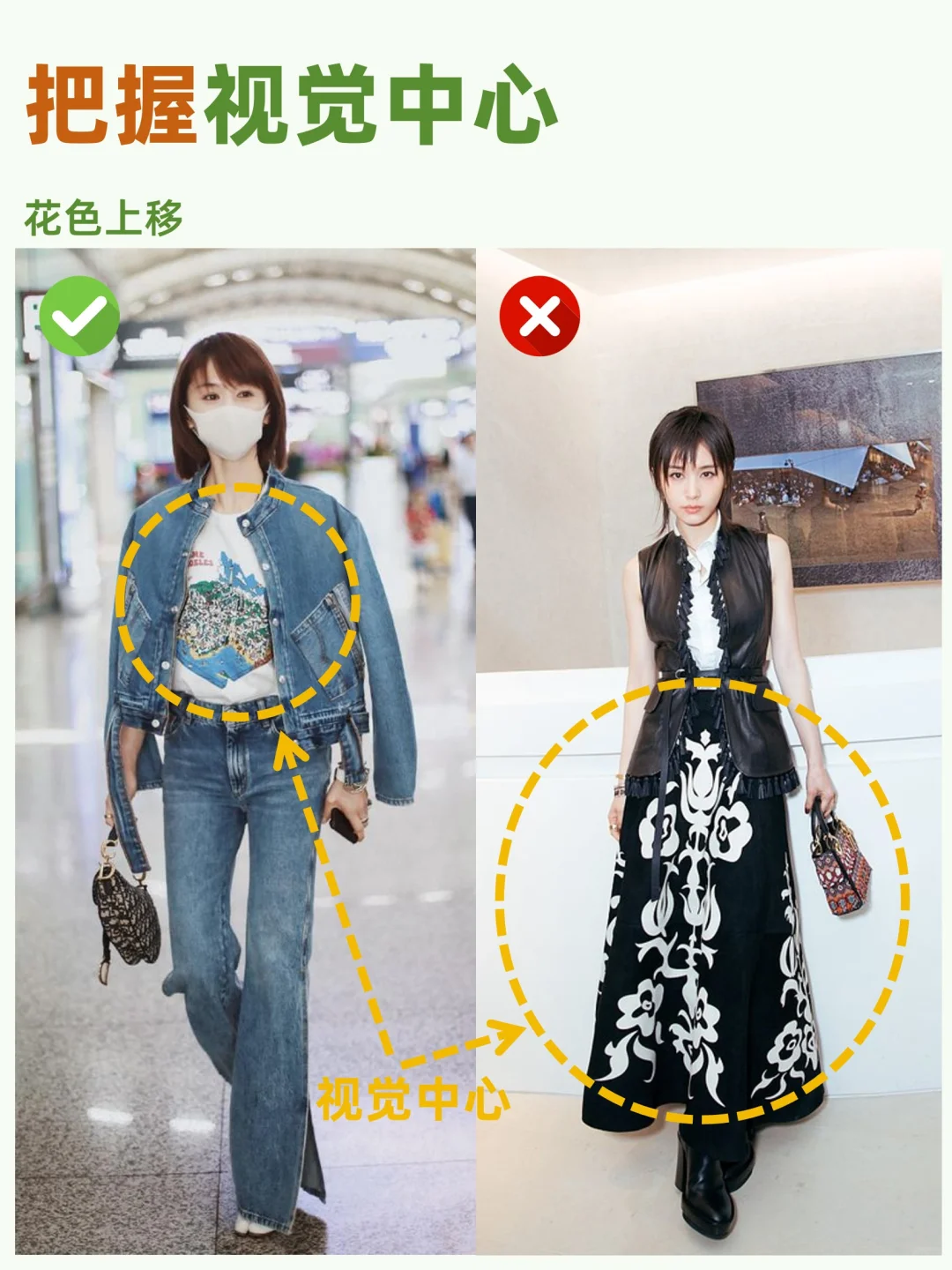 衣服搭配的时候,尽量把🌟亮点(视觉中心)放在上面: