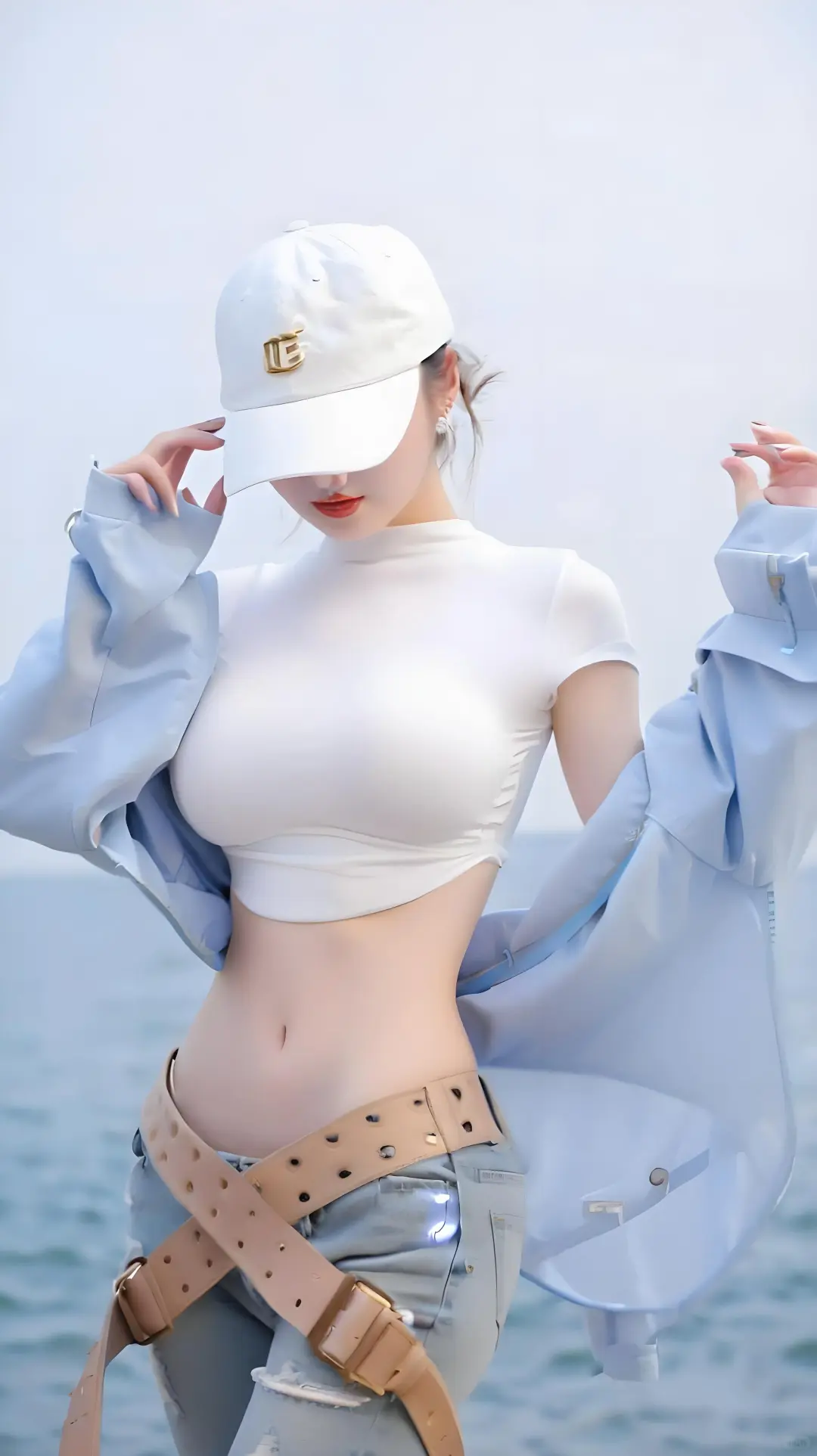 白色露脐短袖衬衫+牛仔裤