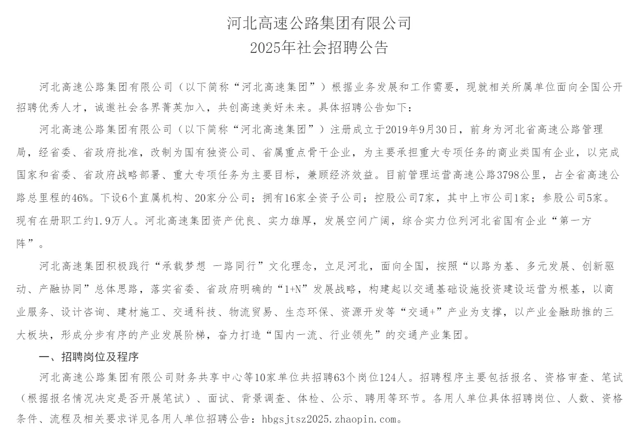 • 招聘单位:河北高速公路集团有限公司(省属重点国企,管理高速公路3798公里)。