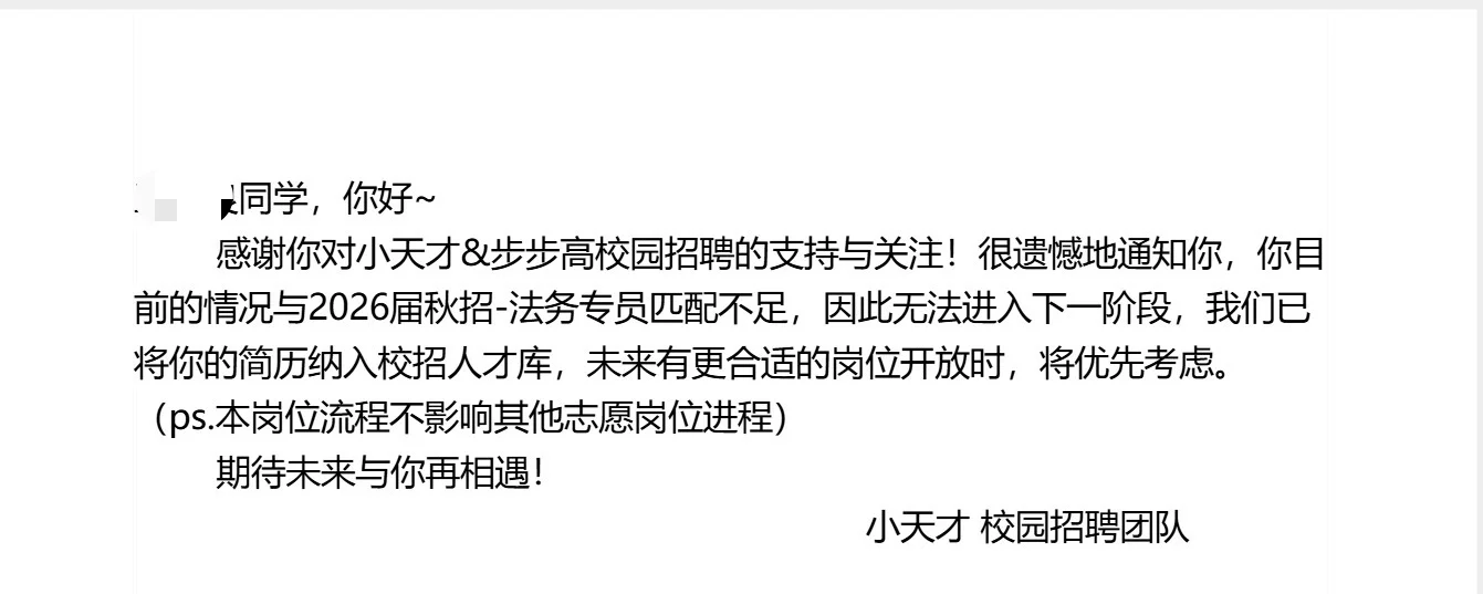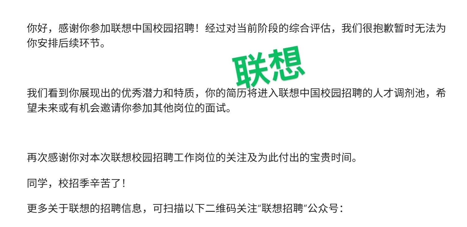 在此之后,也有陆续收到其他企业的挂信,如小天才,联想,理想等等。除内地的之外,香港的岗位我也有投(主包也参加了香港金融科技公司的法务合规岗位面试)。字数有限制,如果这篇看的人多,我有机会再记录下我后续投递秋招和实习的一些面试感悟哈哈(近期情况有所好转!)