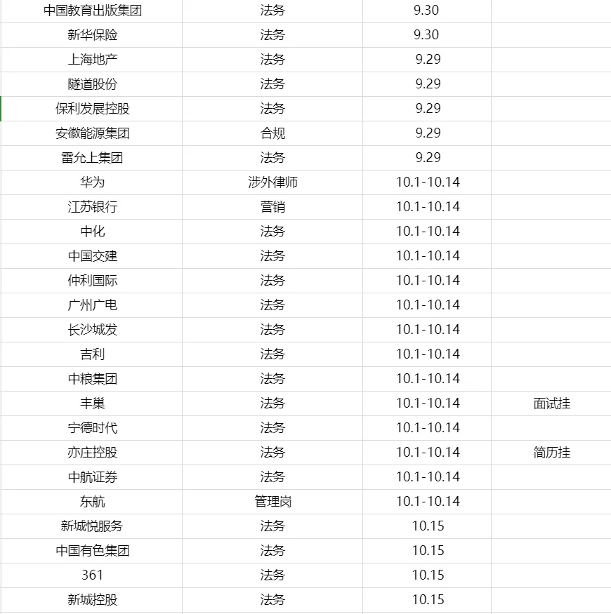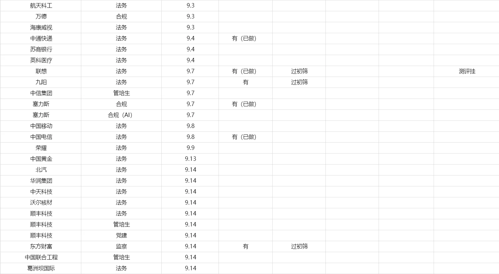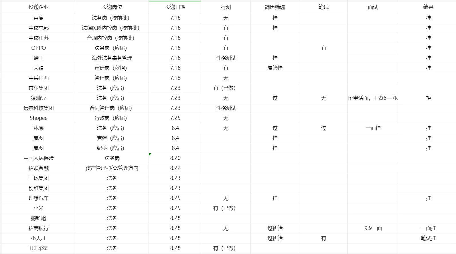 相信很多选择读一年制LLM的朋友和我一样,都想着早点毕业拿到研究生学历,好早早地找到工作。而对25fall来说,9月入学便是秋招,其实何止是9月,我7月底在家的时候就已经开始投递一些企业的提前批的岗位了,结果都毫无例外的“全拒德”。截止目前,据不完全统计,我已经投了快100家企业了(几乎只投递法务岗),有反馈的企业可以说是寥寥无几,做的测评倒是数不胜数。一开始,我还会认真记录投递了哪些企业,哪家企业的进度到了哪里,但是慢慢发现这样太费心费神了,就开始随缘了。
