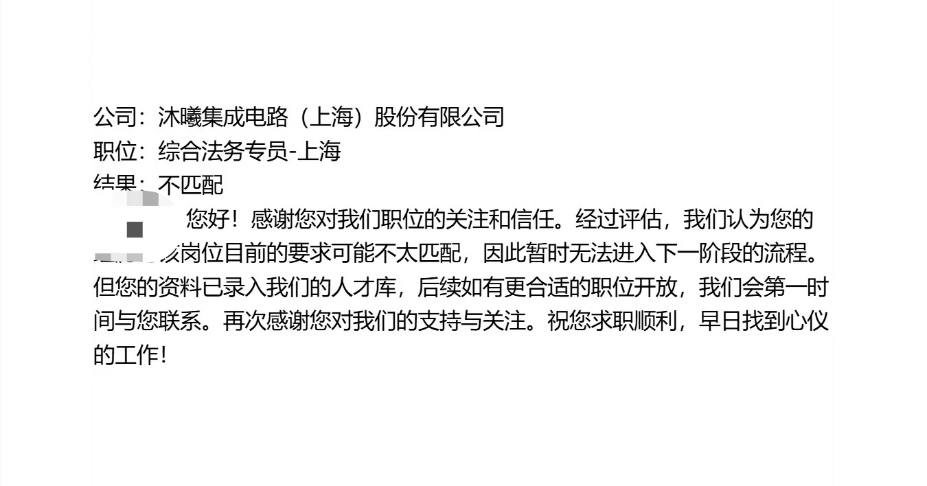 在此期间也不能说一次面试没有,其中就接到了一家上海的芯片公司的面试邀请。这家芯片公司的招聘流程大概是,简历初筛,专业笔试筛选,三次面试(法务经理面、法务主管面、HR面)。这是主包在8到9月份参加的唯一一个面试,所以就详细说一下这一家的情况吧。