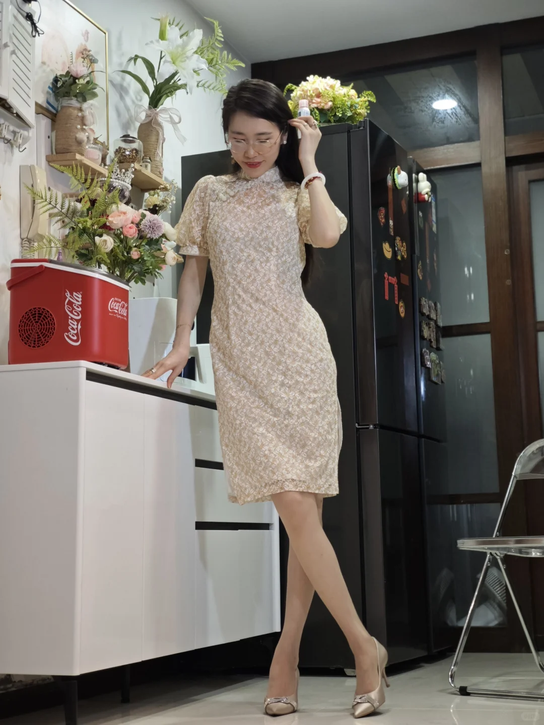 优雅旗袍穿搭:香槟色蕾丝旗袍➕蜜色高筒袜➕香槟色高跟鞋~
