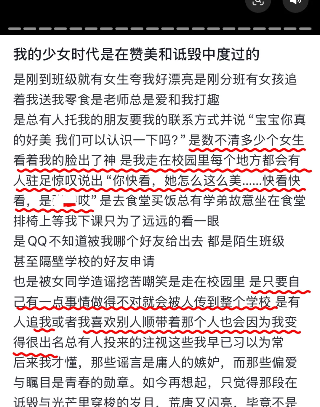 客观评价来说嘴巴挺好看笑起来很甜,其他五官长得很平凡。皮肤状态一般,肤色偏黑,且眼光很土。比她好看的女生多了去了,发出这种文案来的意义是啥,有啥优越感吗?像从冷宫里爬出来的妃子,经常在学校和网络上与人有矛盾,难道不是你也有问题吗?不然哪来这么多事,我们学校根本不存在霸凌或者欺负人事件,而且你也不可能受到欺负,毕业了发这么一点少女时代……是在跟风还是?意义不明。#女生就应该自信明媚 #我的漂亮只献给我自己 #各种样子都是美丽的我 #自信的女孩最美丽 #美女就是我 #美的毫不费力 #大方展示美丽 #长什么样不重要 #美没有标准