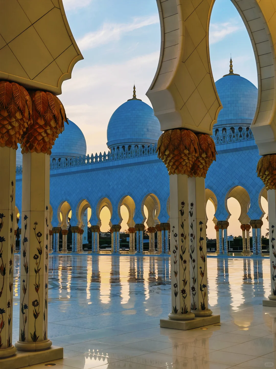 白天在结束阿布扎比总统府和海上卢浮宫的行程后,算好时间在黄昏来临前出发前往谢赫扎伊德清真寺,重新换上白色带金边罩袍+白色金饰头巾,去阿布扎比最神圣最有设计感的清真寺~🕌,纯白建筑加超大穹顶配上黄昏光线,随手一拍都是充满异域风情的天堂级大片~📷