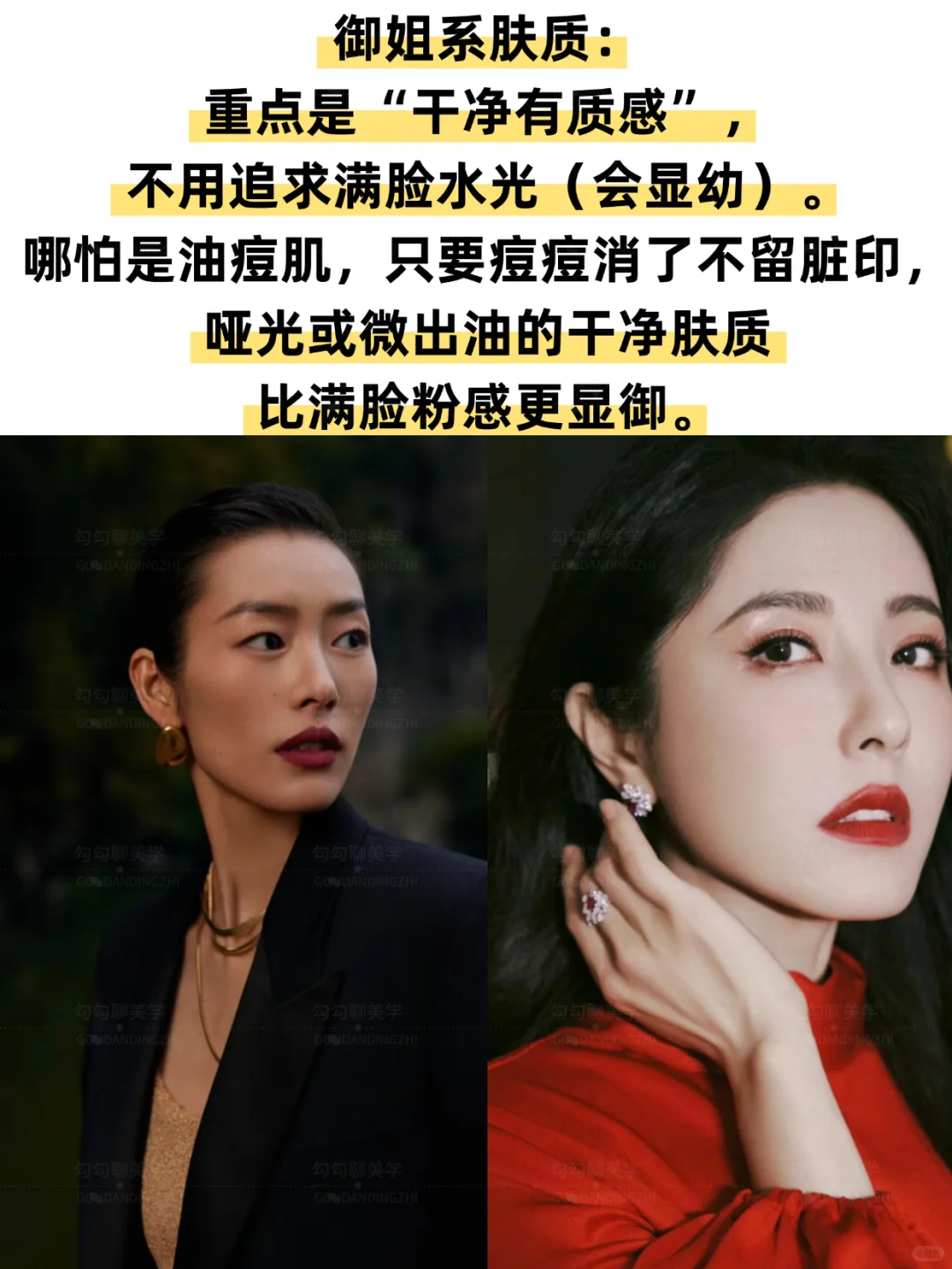 肤质:重点是“干净有质感”,不用追求满脸水光(会显幼)。哪怕是油痘肌,只要痘痘消了不留脏印,哑光或微出油的干净肤质,比满脸粉感更显御
