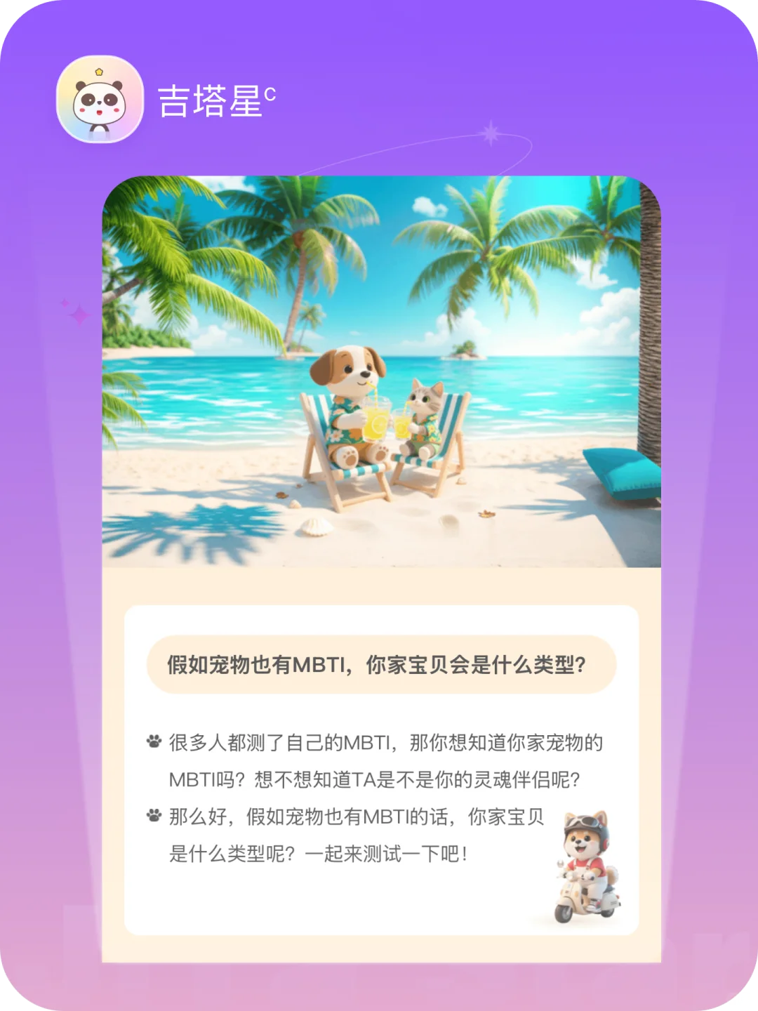 家里有可爱萌宠的铲屎官们注意啦🐾 在吉塔星,还能探索你家宝贝的独特性格。了解它的小脾气、小喜好,让你们的相处更加有爱,是不是很有意思?