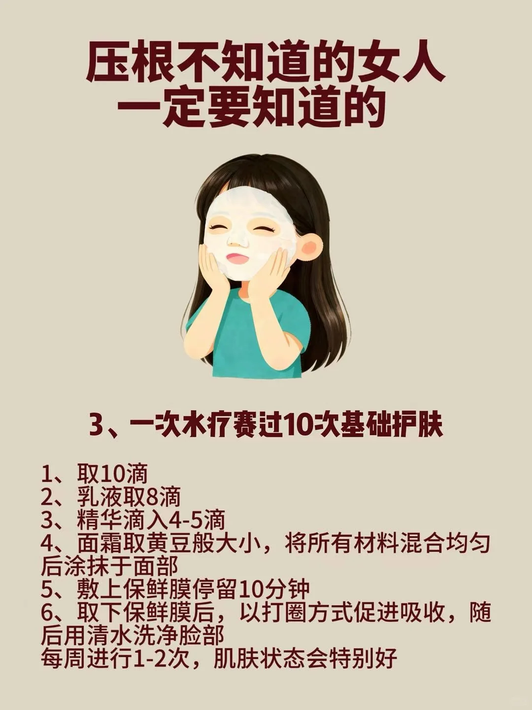 取玻尿酸原液5泵、精华乳3泵,再加2颗黄豆大小的神经酰胺面霜,将三者搅拌成酸奶状后厚敷全脸,接着在外面盖上用温水泡过的洗脸巾,8分钟后皮肤就能喝满三重营养,脸蛋嫩得仿佛能掐出水!