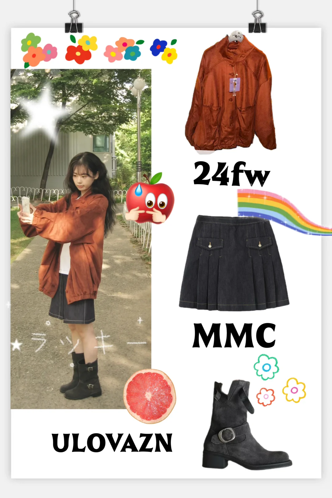 • 单品组合:以“复古工装外套+深色短裙”构建休闲复古的核心框架,工装外套的宽松版型与短裙的利落廓形形成版型对比,中筒靴则从鞋履维度强化复古风格,让整体造型层次丰富且风格统一。