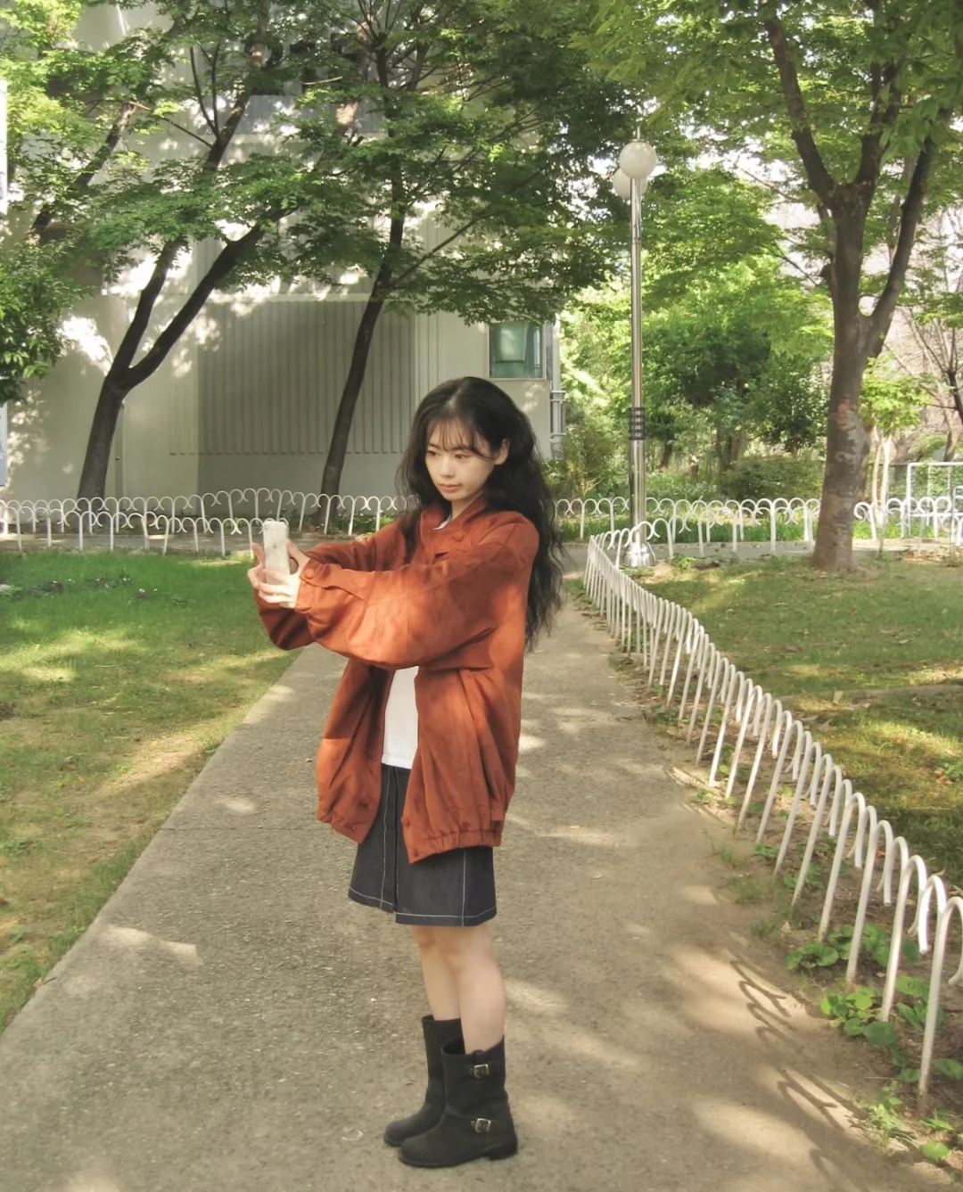 • 色彩搭配:采用“棕红复古色+深色基础色”的组合,棕红色外套作为视觉亮点,深色短裙和黑色靴子形成基础配色,色彩对比鲜明且富有复古张力,适配户外休闲场景。