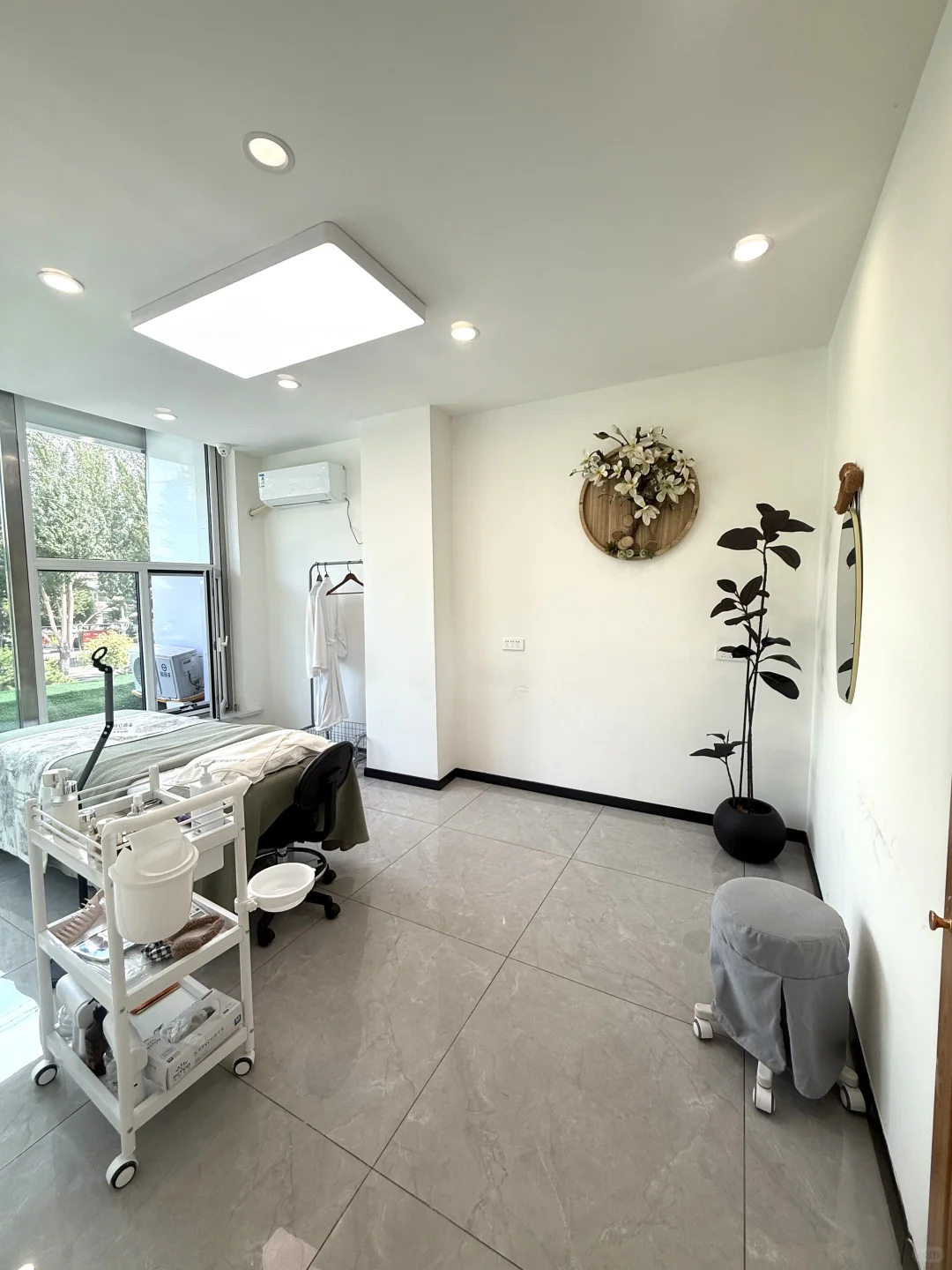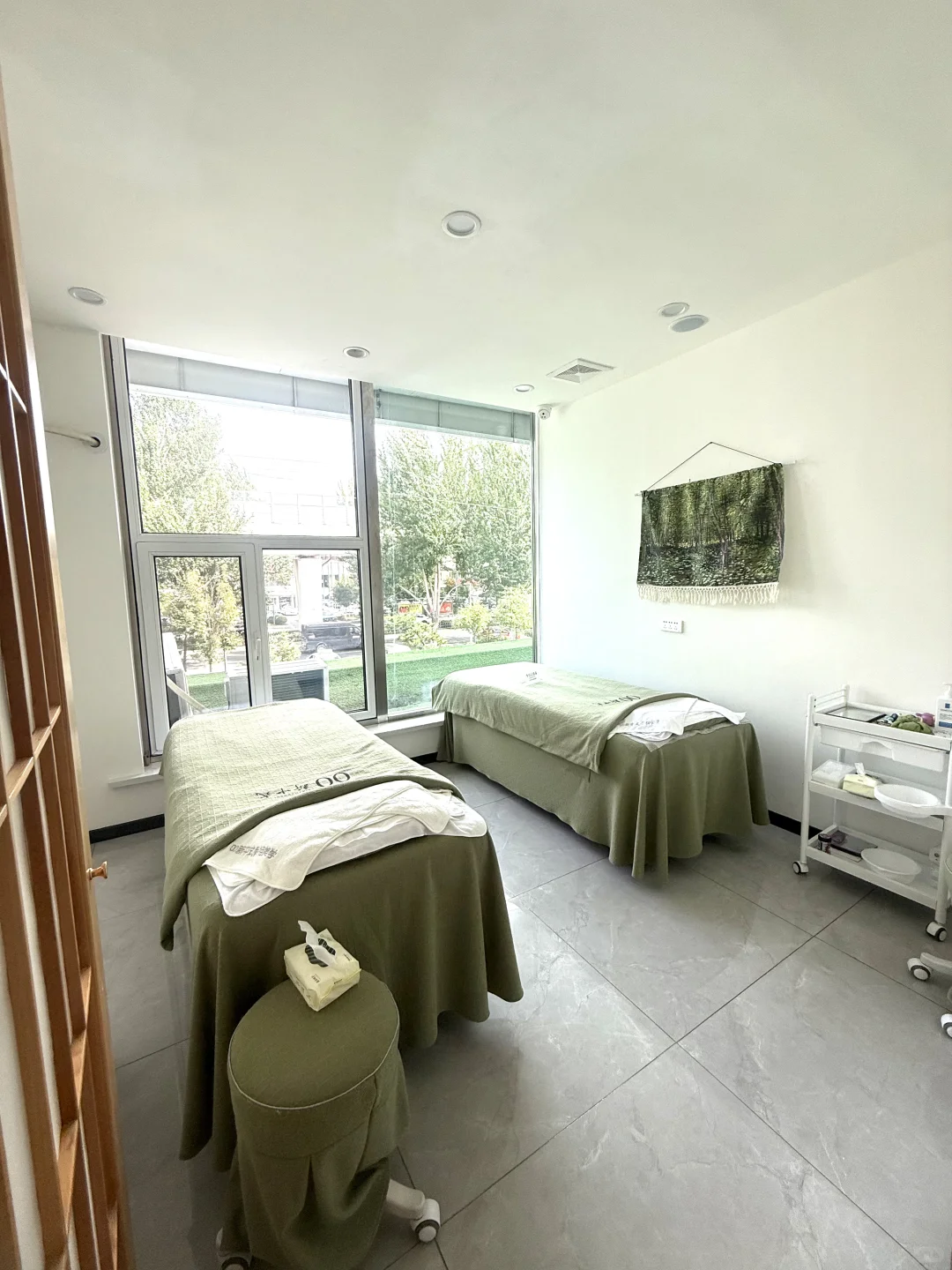 操作间也干净得很,铺着软乎乎的米色床品,连轻音乐都是舒缓的古琴曲,做脸的时候听着特放松,完全没有那种“赶流程”的局促感~