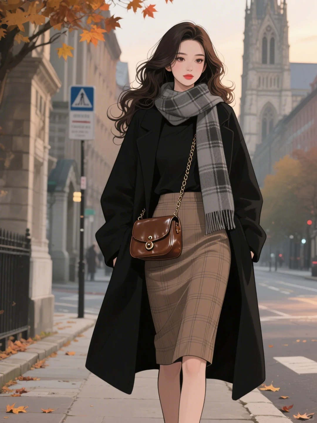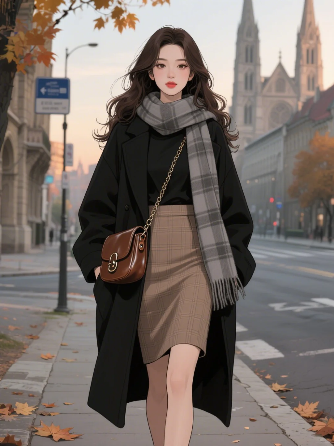 女生斜挎棕色皮质链条金属纽扣包包,身穿黑色内搭,下身穿浅棕色格纹半身裙,外穿黑色长款宽松大版呢大衣,戴灰色色格纹围巾