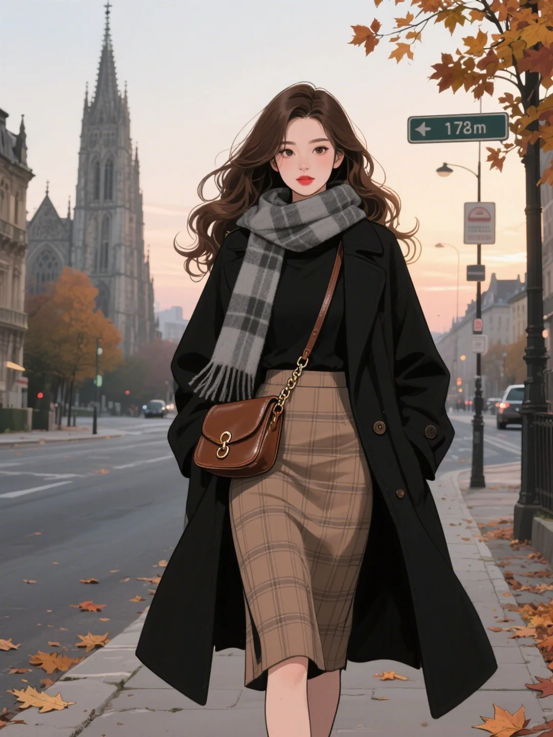 , 女生高高瘦瘦,傍晚走在街边人行道上,建筑模糊 路边有枫叶落下, 远处有欧式大教堂,路边,路牌,。 远景平视镜头