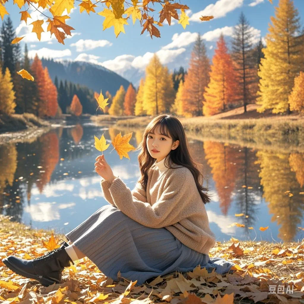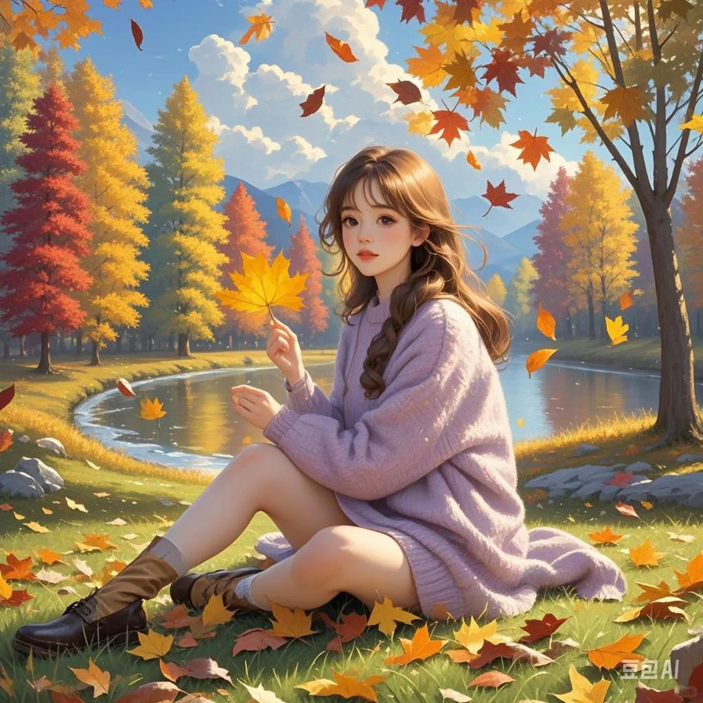 • 色彩:整体色彩以秋天的暖色调为主,如金黄色、橙色、红色和棕色,辅以少女服装的柔和色彩,如淡紫色或粉色,形成温暖而和谐的色彩对比。