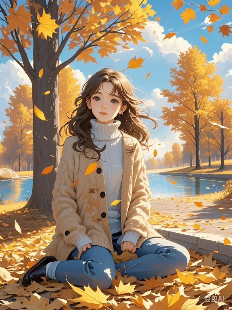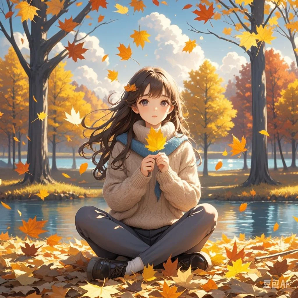 • 前景:少女坐在或站在落叶覆盖的地面上,周围是飘落的树叶,可以有一些树叶轻轻落在她的发梢或肩上。