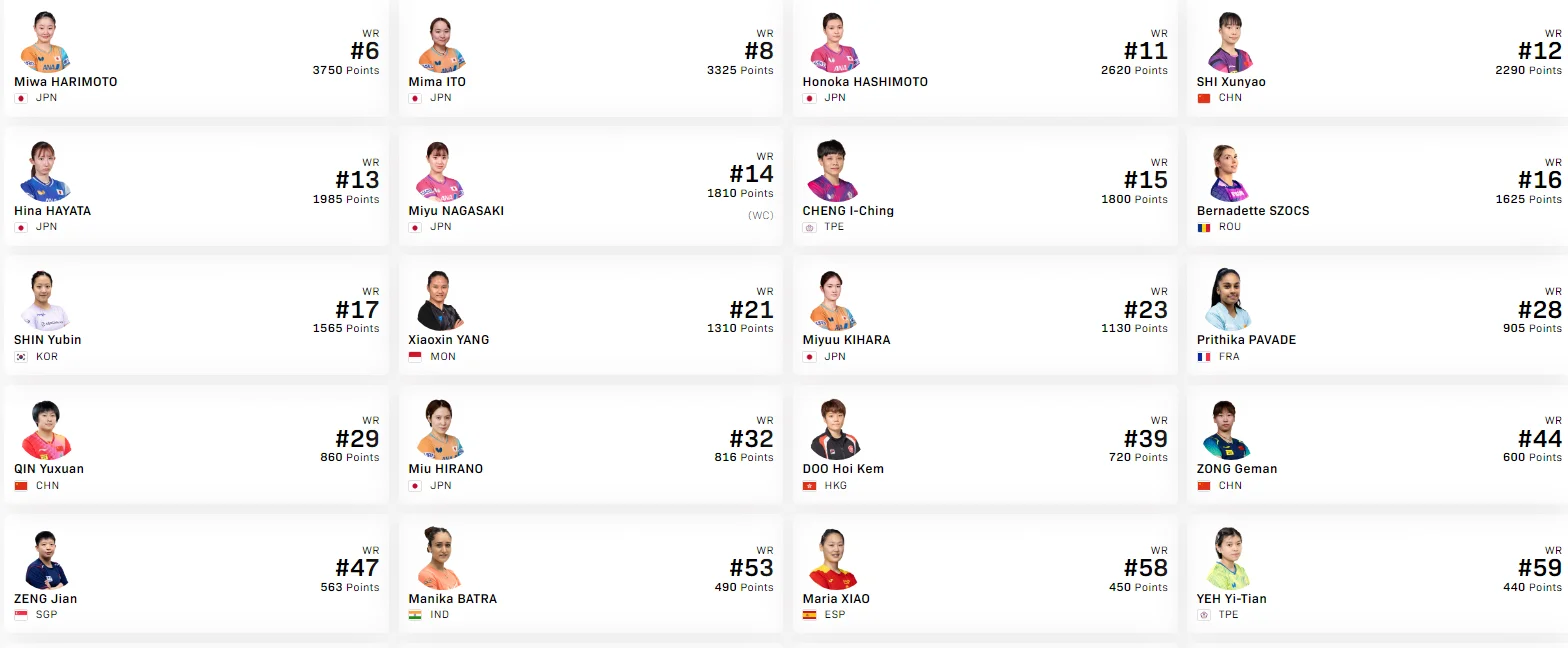 中国女乒派出石洵瑶、覃予萱、韩菲儿、纵歌曼、杨屹韵参加单打比赛,覃予萱/纵歌曼、韩菲儿/杨屹韵参加双打比赛。