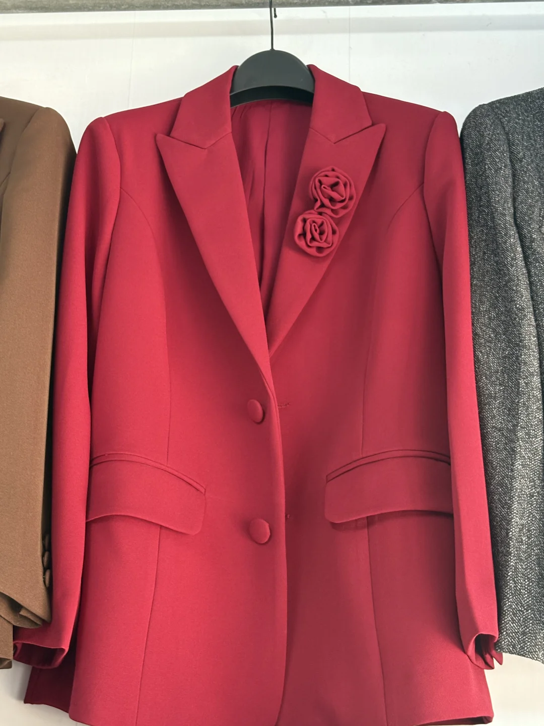 一眼沦陷的酒红缎面料,版型收腰但不勒,肩线刚好撑出直角肩!最戳我的是领口的立体玫瑰装饰——明明是通勤西装,却藏着法式浪漫的小心机,搭黑裙是宴会焦点,配牛仔裤又飒又媚~