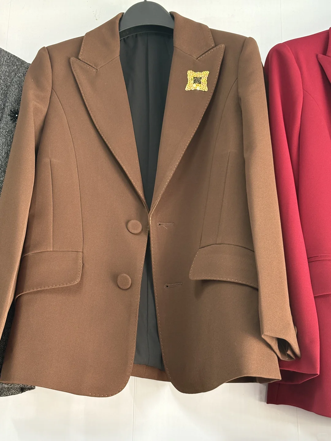 看似基础的驼棕色,细节全是惊喜:领口的明线针脚工整到想裱起来,胸口的亮片胸针是老板特意选的“点睛款”,上班穿高级不张扬,约会加条丝巾就能换风格。
