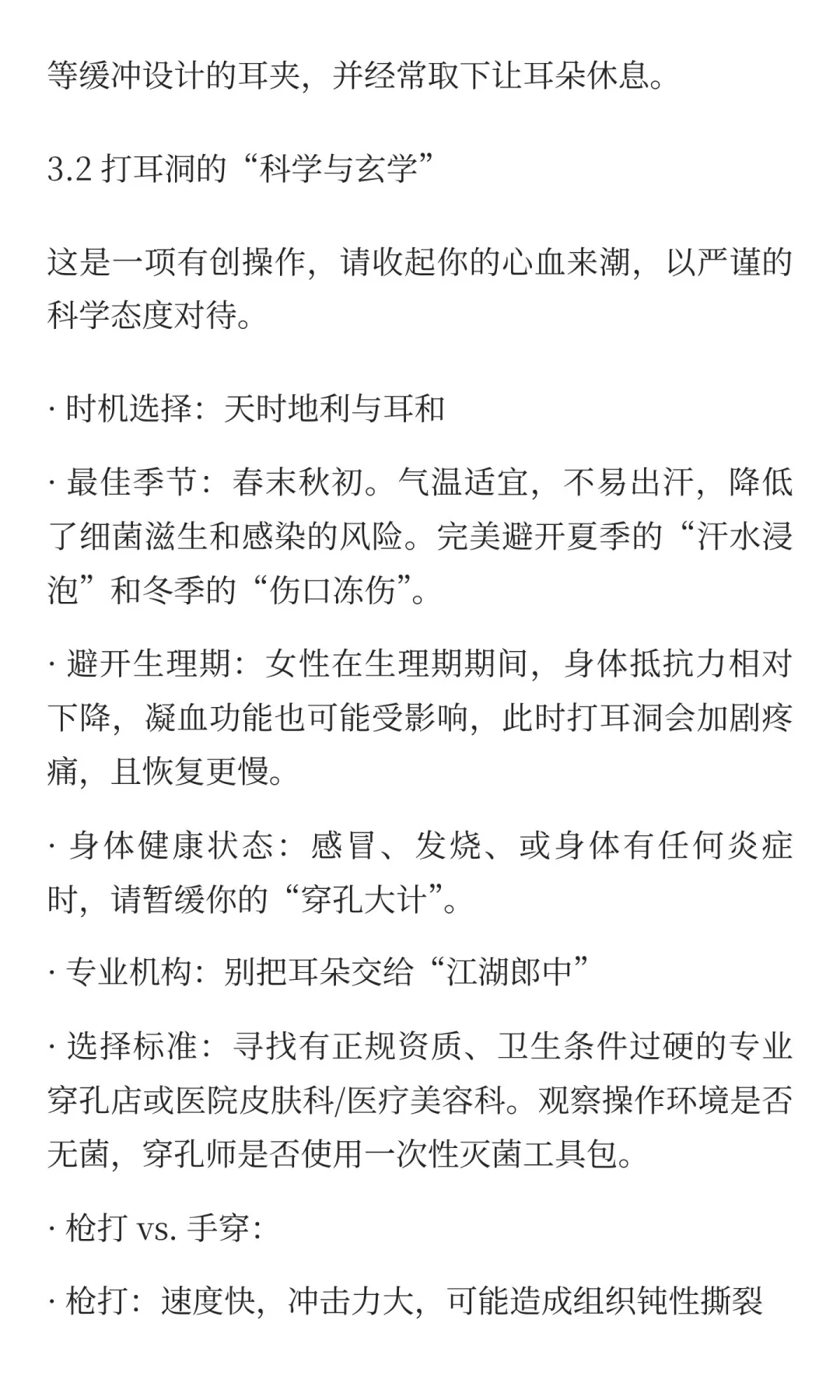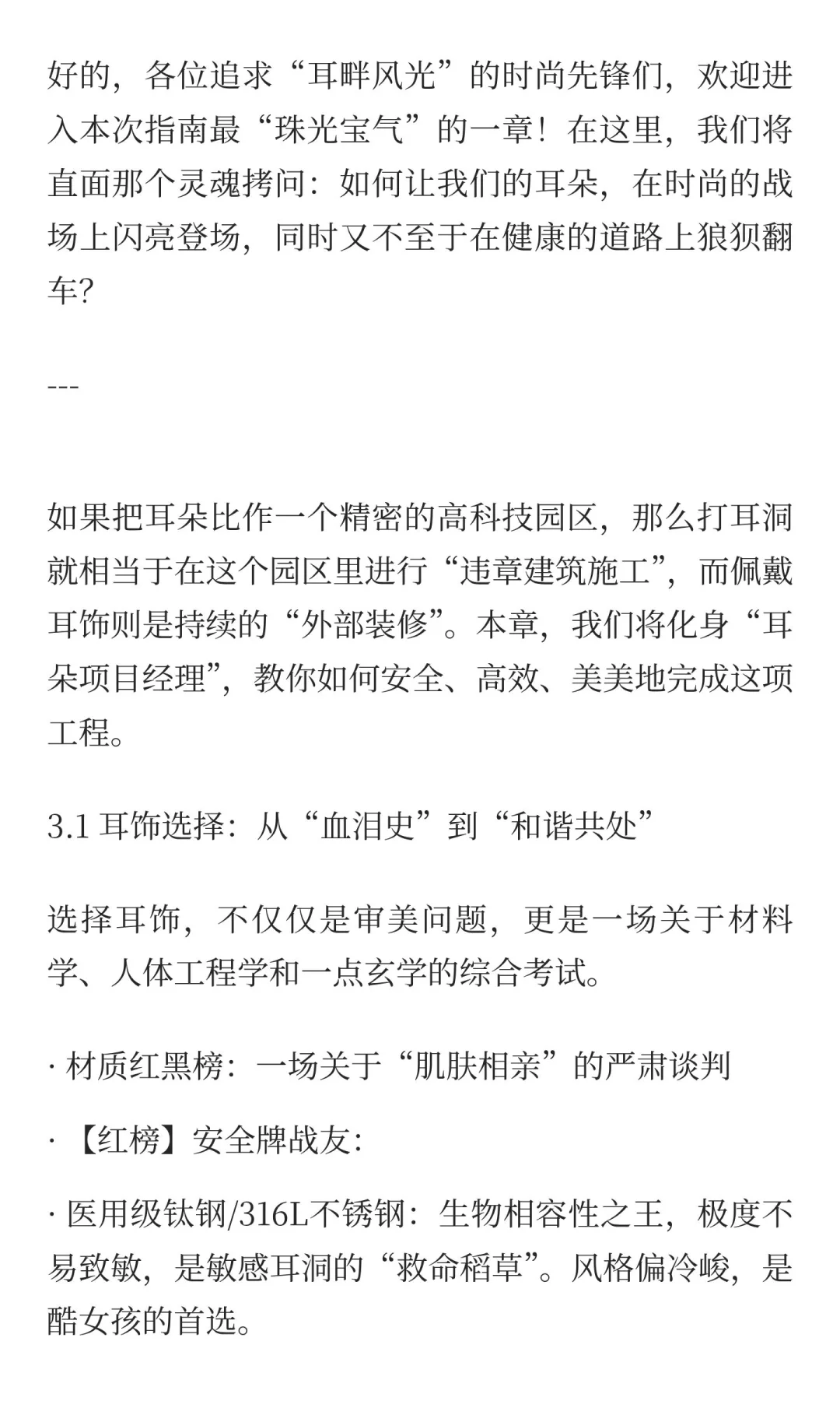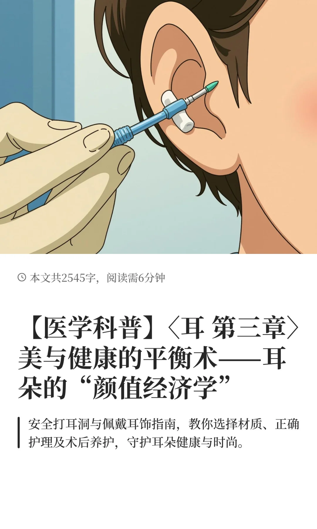 本章教你如何安全、高效地打耳洞和佩戴耳饰,选择安全材质如钛钢、316L不锈钢,避免镍合金。打耳洞需专业机构,术后保持干燥清洁,避免感染。长期佩戴安全耳饰,保护耳朵健康。
