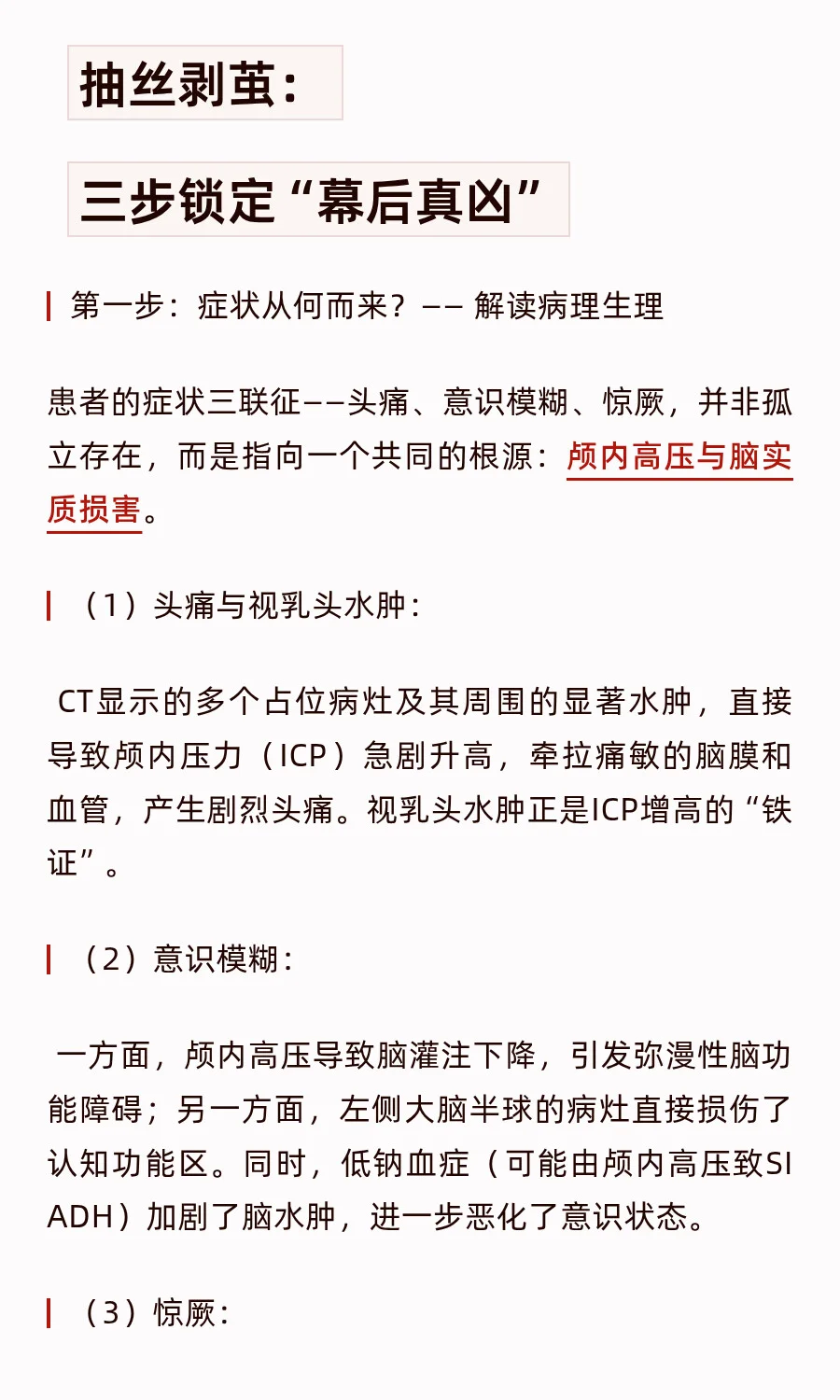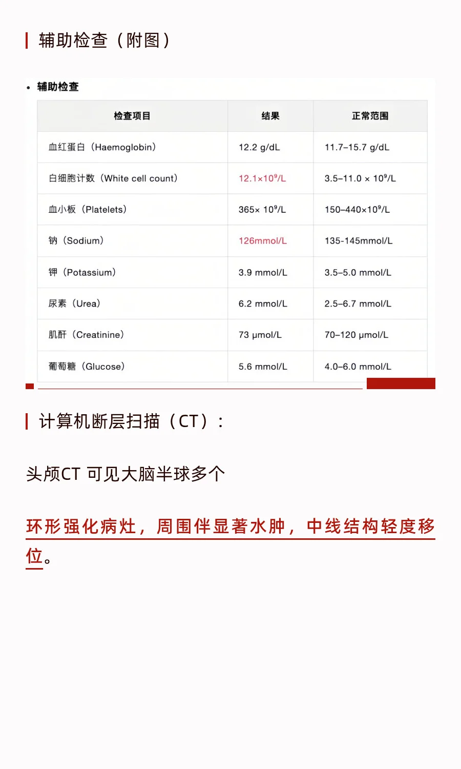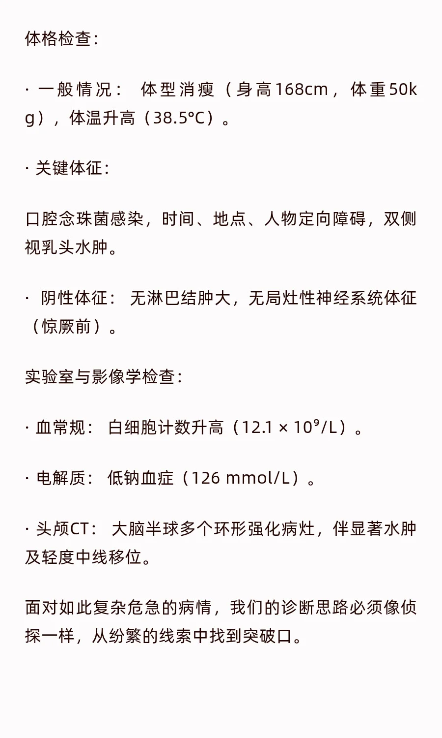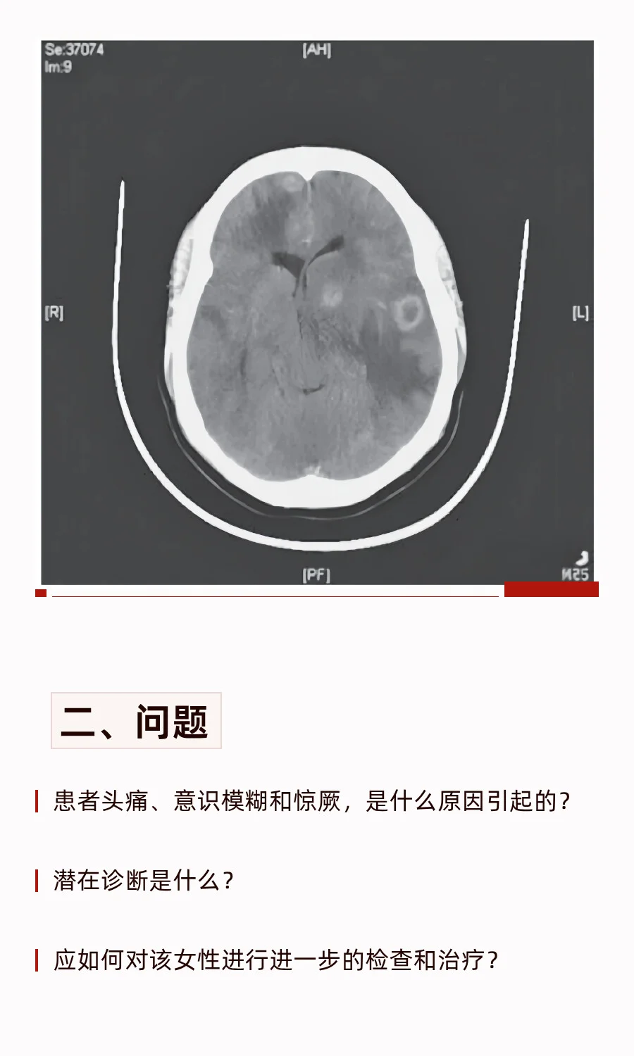 🧠 脑部异常: 头颅CT显示,她的大脑里有好几个“圆圈样”的病灶,周围有严重的水肿。