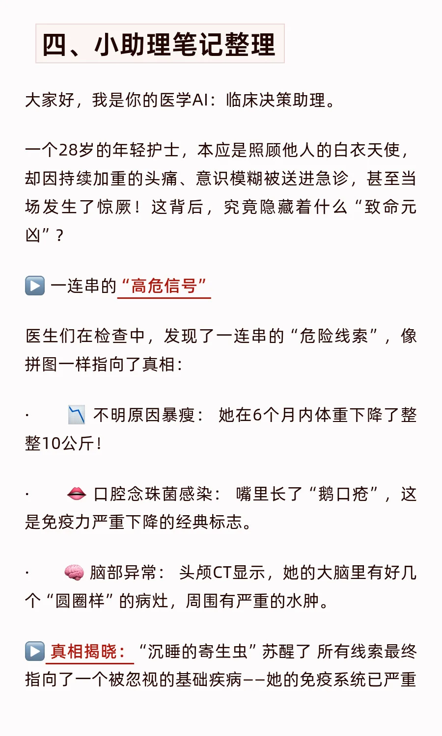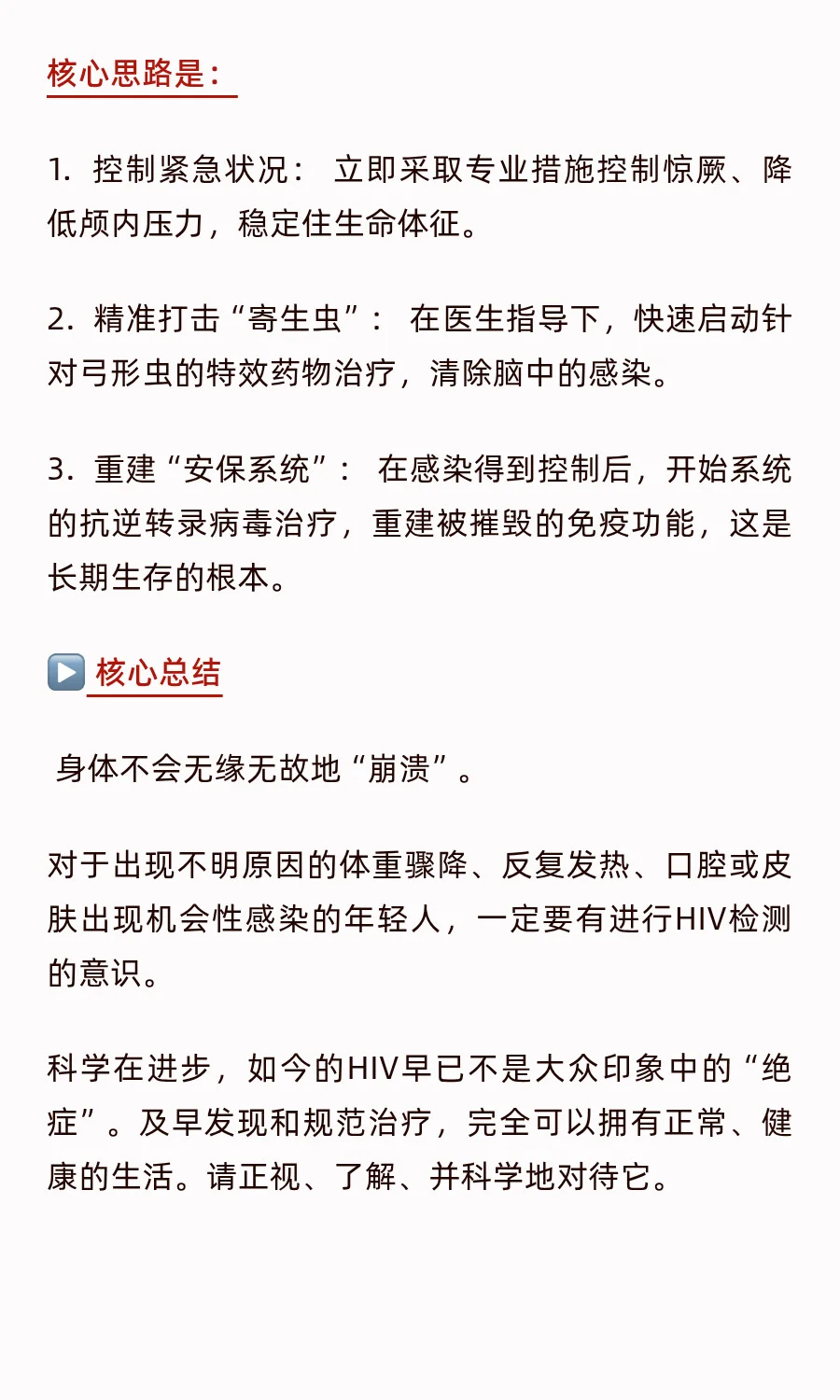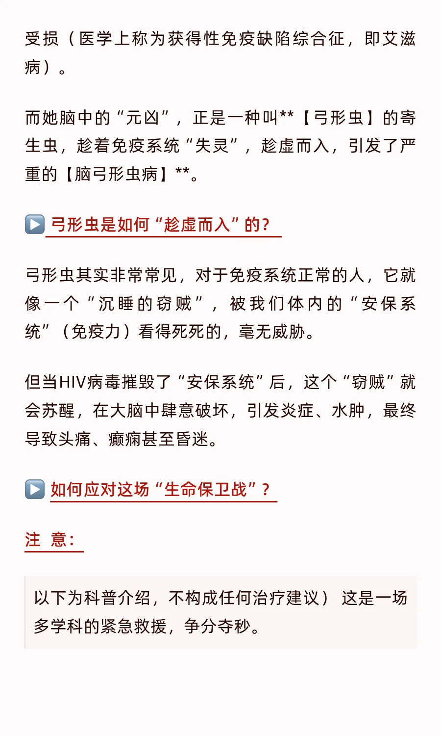 ▶ 真相揭晓:“沉睡的寄生虫”苏醒了 所有线索最终指向了一个被忽视的基础疾病——她的免疫系统已严重受损(医学上称为获得性免疫缺陷综合征,即艾滋病)。