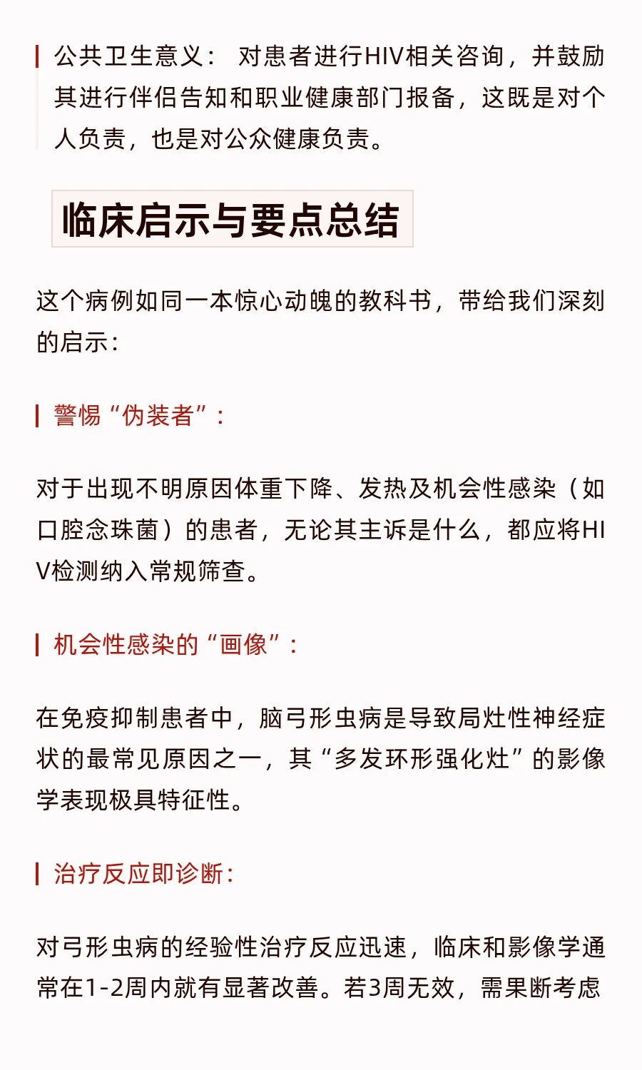 ▶ 核心总结 身体不会无缘无故地“崩溃”。对于出现不明原因的体重骤降、反复发热、口腔或皮肤出现机会性感染的年轻人,一定要有进行HIV检测的意识。