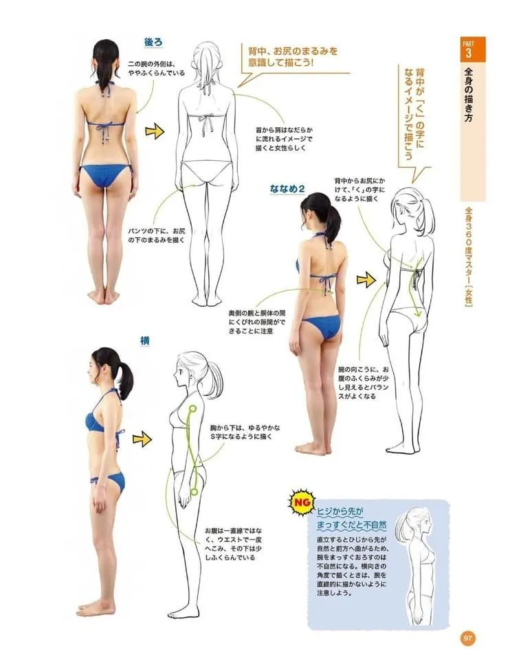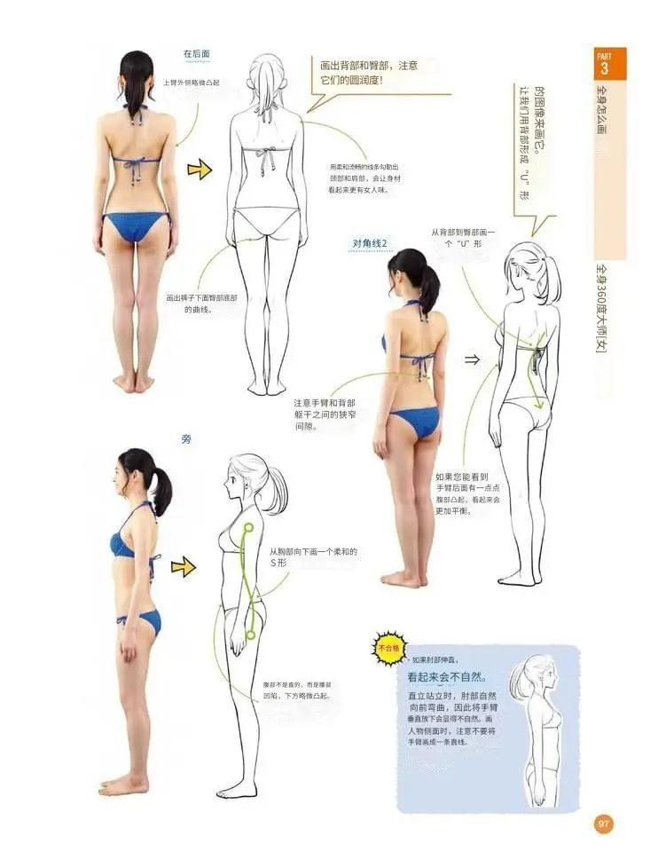 ✅ 为了表现身体厚度,手臂后面可以带一点腹部的隆起(ふくらみ)。
