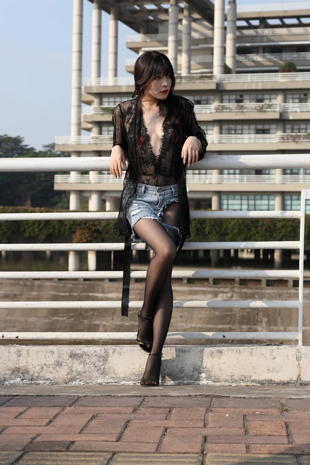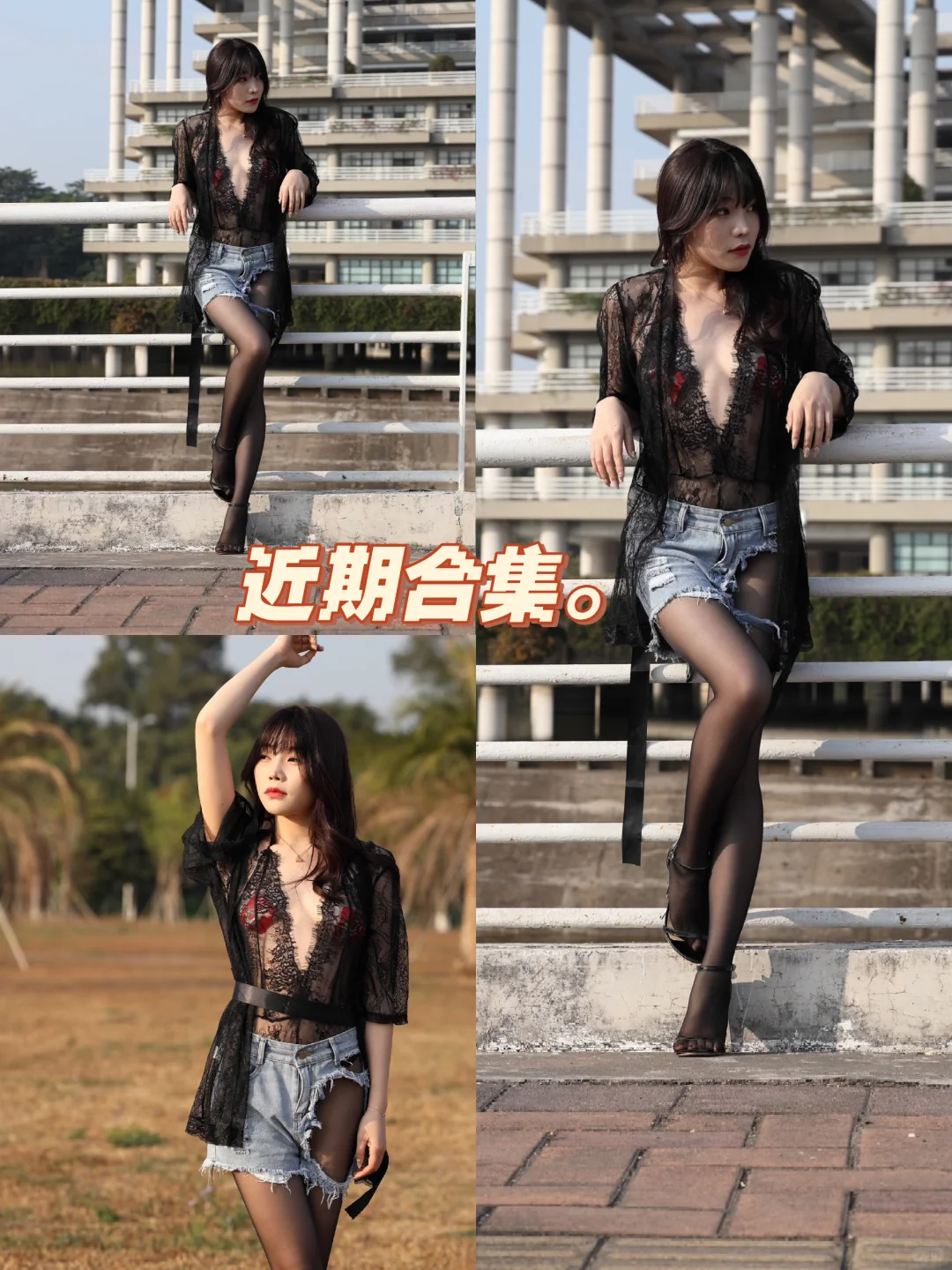 蕾丝外套牛仔短裤黑丝