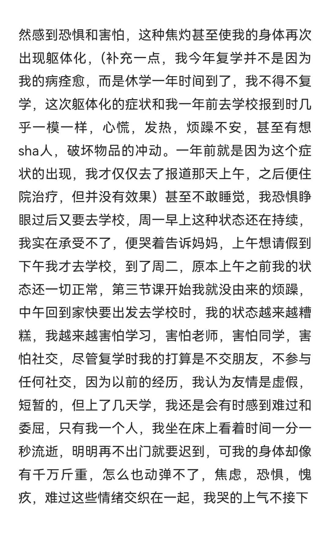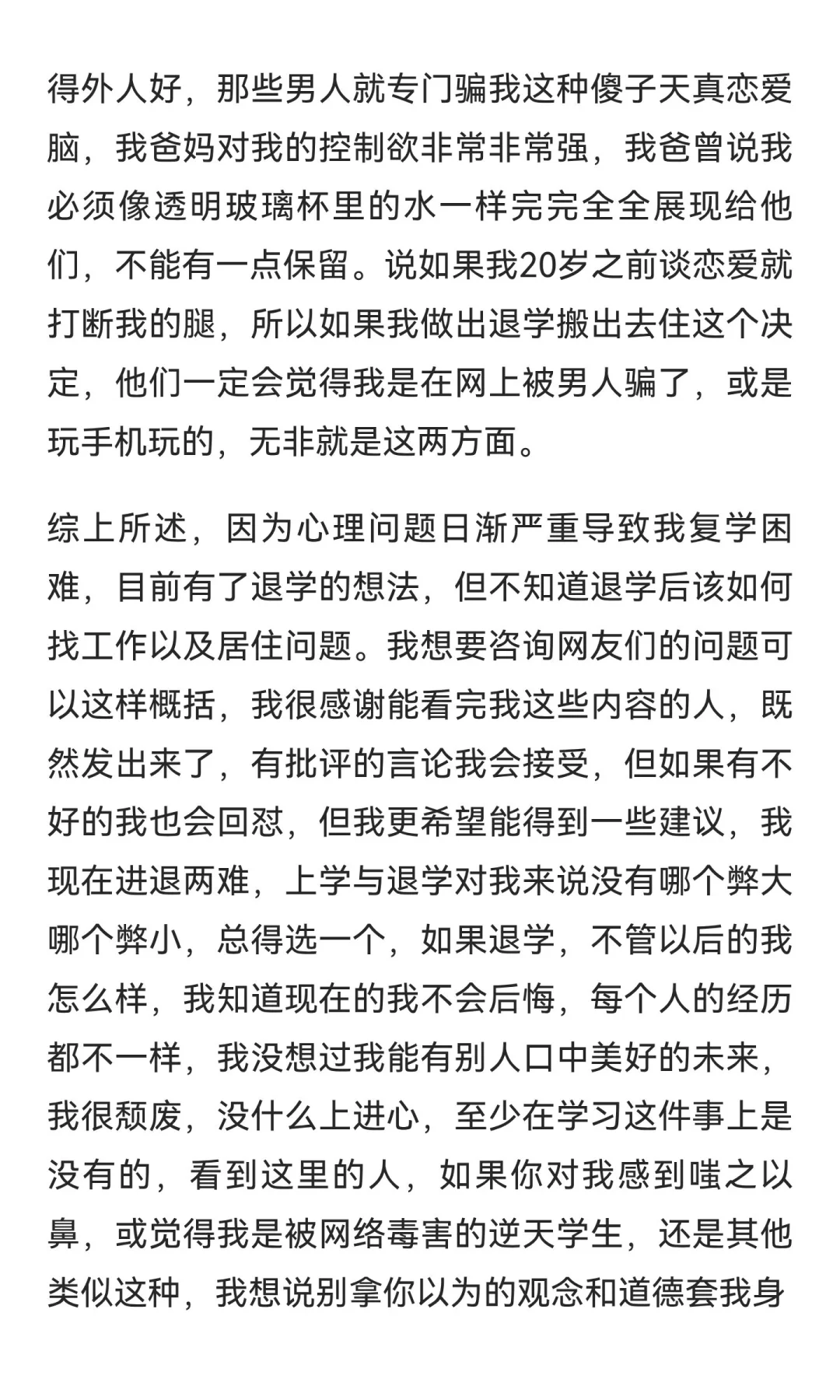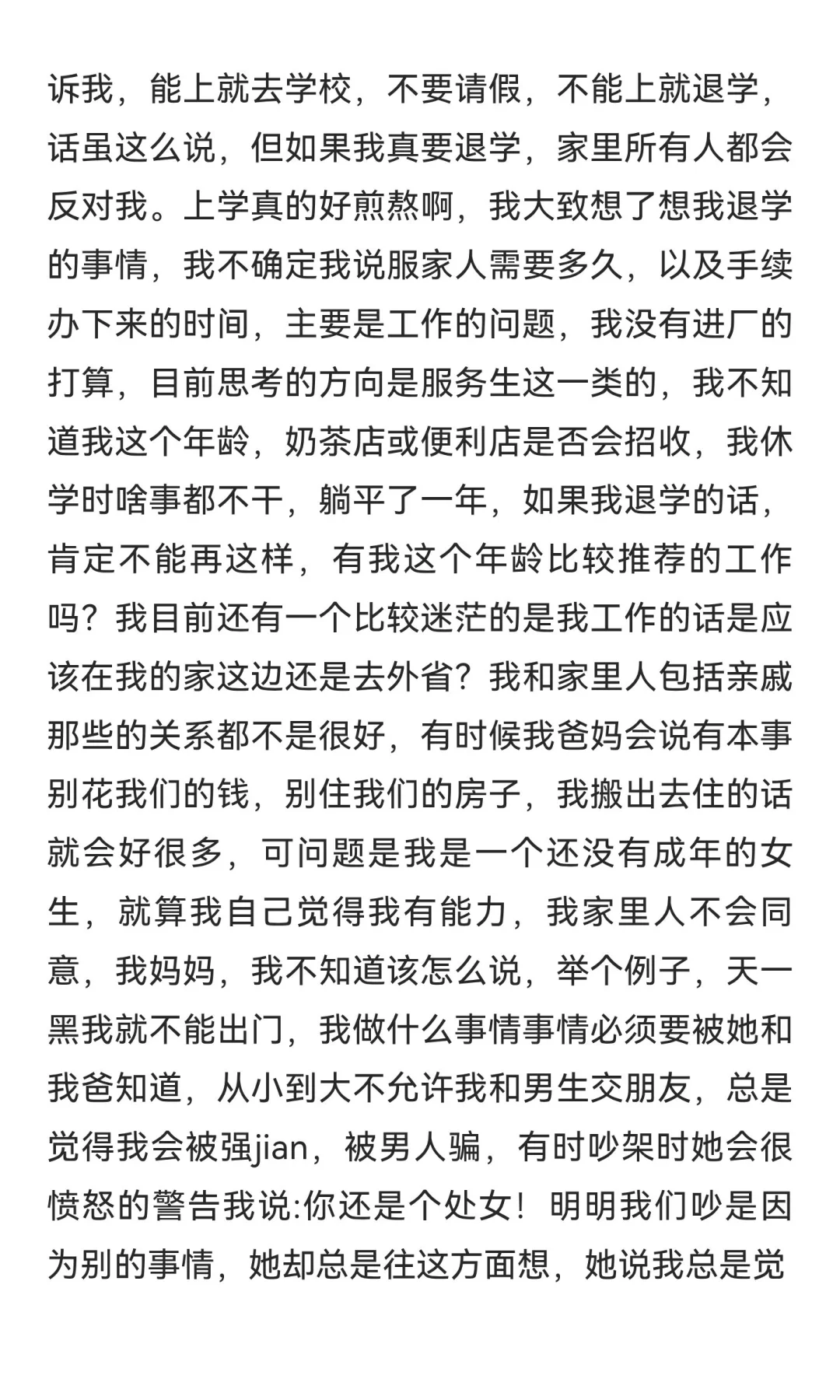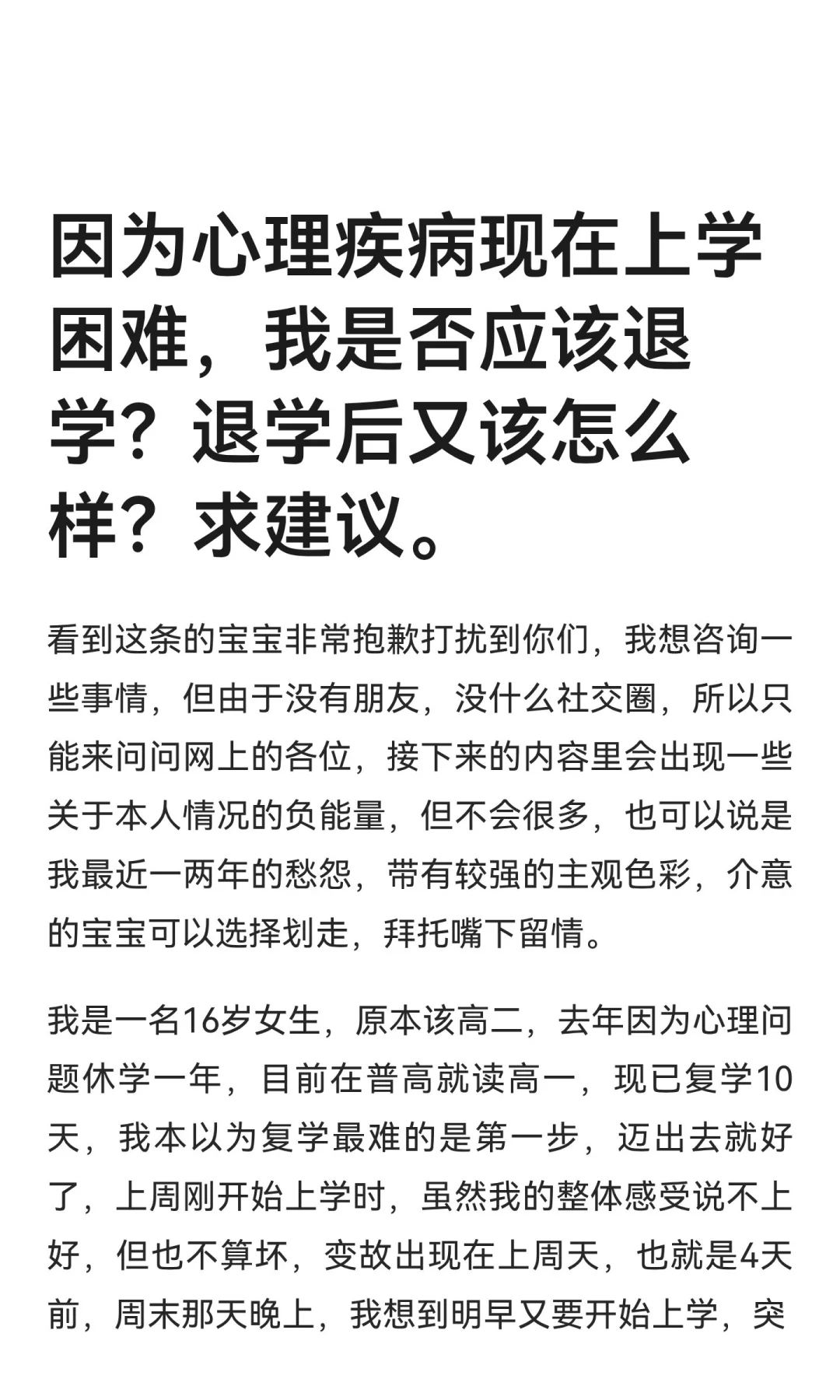 16岁女生因心理问题休学一年后复学,但复学后情绪波动加剧,出现躯体化症状,无法适应学校生活。面临退学与工作、居住问题的困境,家庭控制欲强,父母反对退学。希望寻求帮助,摆脱困境。