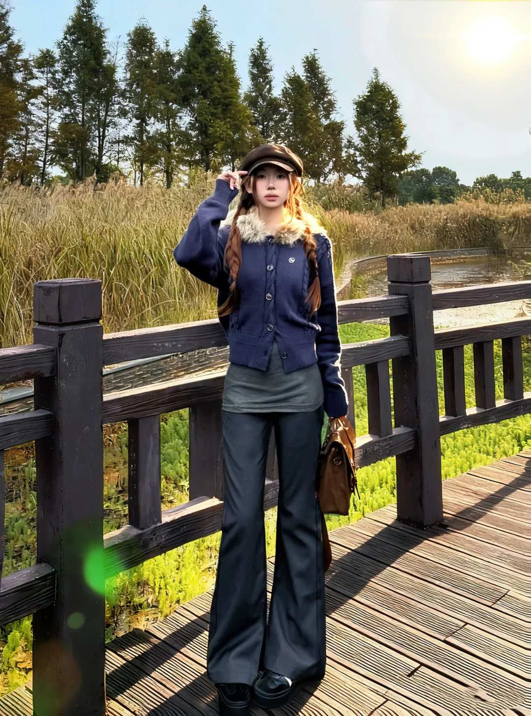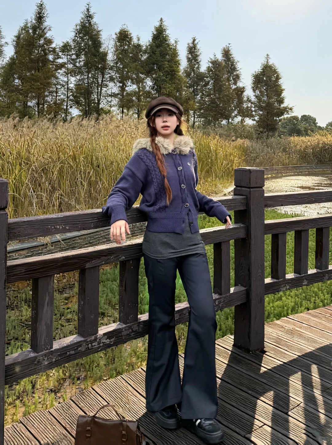 藏青色毛领毛衣➕灰色西装裤