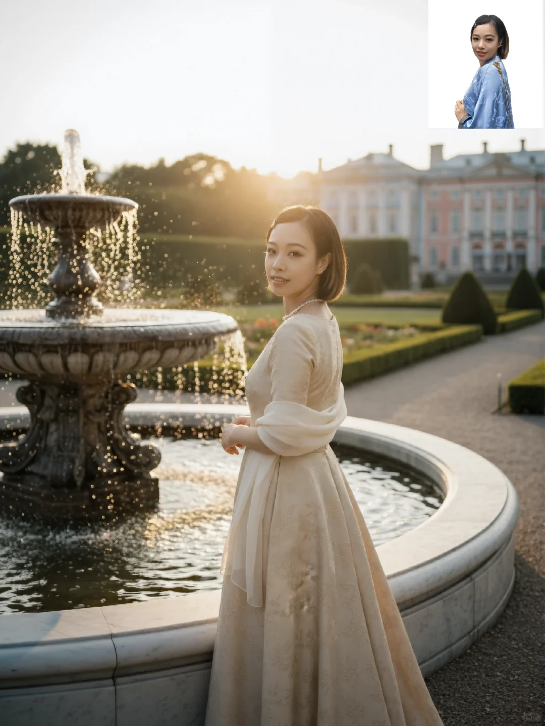 \"prompt\": \"超写实庭院人像。大理石喷泉与修剪花篱之间,她在喷泉边回身停步,神态清新优雅。日落侧逆光在水雾上形成细碎琥珀高光与人物轮廓勾边;配色偏柔金调与现代摄政的粉蓝/奶油系。\", \"identity\": { \"reference_images\": [\"<上传你的参考人像>\"], \"constraints\": [\"保持与参考图一致的面部结构与身份特征\", \"神态从容、优雅、明净\"] }, \"scene\": { \"setting\": \"庭院喷泉、修剪花篱、石径\", \"elements\": \"大理石水盆、水滴与雾化水珠、低矮花境、远处建筑线\", \"atmosphere\": \"清新、优雅、柔金\" }, \"wardrobe\": { \"outfit\": \"米金礼裙(现代摄政风:帝国高腰、流畅裙身、无重装饰)\", \"shawl\": \"轻纱披肩(奶油白或极浅粉,半透明)\", \"accessories\": \"极简珍珠或母贝项链(二选一),低反光\", \"footwear\": \"浅色低跟鞋(简洁)\" }, \"lighting\": { \"schema\": \"日落侧逆光为主,水面与地面反射作次要补光;保留水滴高光\", \"tone\": \"warm golden hour ~5200–5600K\", \"quality\": \"soft directional rim + gentle fill\", \"exposure_compensation_ev\": \"-0.3\" }, \"camera\": { \"focal_length\": \"50mm\", \"framing\": \"三分之二身\", \"composition\": \"人物沿喷泉弧线转身回望;三分构图,背景花篱与建筑线收束\", \"aperture\": \"f/2.8\", \"shutter_speed\": \"1/500s\", \"iso\": 400, \"focus\": \"single-point on near eye(注意逆光)\", \"depth_of_field\": \"moderate shallow(保留水滴散景层次)\" }, \"color_grade\": { \"palette\": \"柔金、奶油白、粉蓝、修篱绿、大理石灰白\", \"look\": \"高光柔和不过曝、色彩明快但克制;皮肤自然\", \"grain\": \"very subtle\" }, \"quality_targets\": [ \"逆光勾边干净,水滴高光细腻无爆点\", \"礼裙与披肩的材质区分清楚(缎/纱)\", \"花篱层次与建筑线条不失真\", \"肤色在日落混光中保持统一\" ]