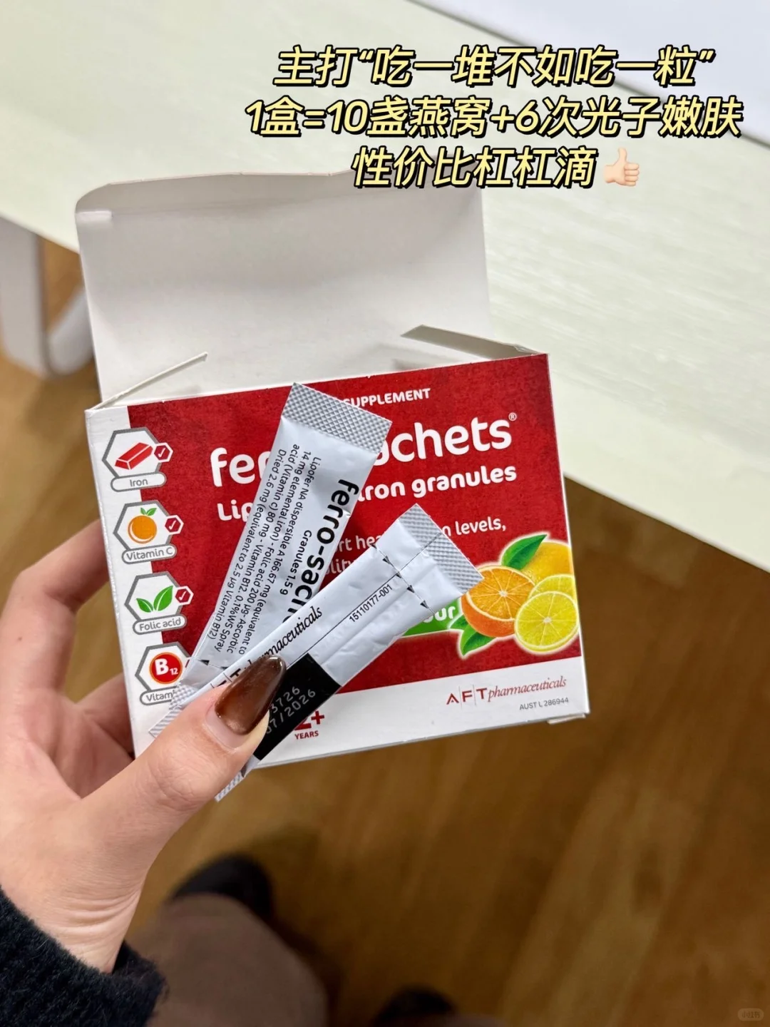 它喝起来是童年果珍粉的味道,酸酸甜甜的。它主打的是\"吃一堆不如吃一粒\"的高效理念,1盒补铁剂就相当于10盏燕窝+6次光子嫩肤的营养价值,直接为我们省了一大笔钱,性价比拉满🥳。特别值得一提的是它的科学配比,每条含有80mgVC+14mg铁,双重吸收让补铁效果更明显。独立包装的设计既干净卫生,又方便随身携带👍