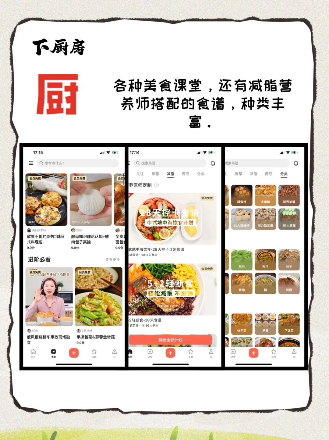 下厨房:想做低卡餐就翻里面的教程,还有营养师配好的食谱,三餐换着花样吃也不怕吃胖。之前总担心吃太单调,跟着做既能控制热量,也能吃饱饱,不会挨饿啦。