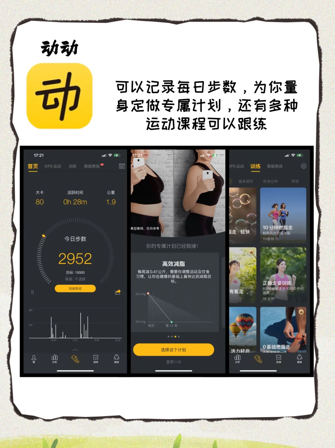 动动:会根据个人情况给减肥计划,每天做了什么也能记下来看进度。运动课程从简单到难都有,我这种不咋锻炼,没啥基础的也可以跟着做下来。